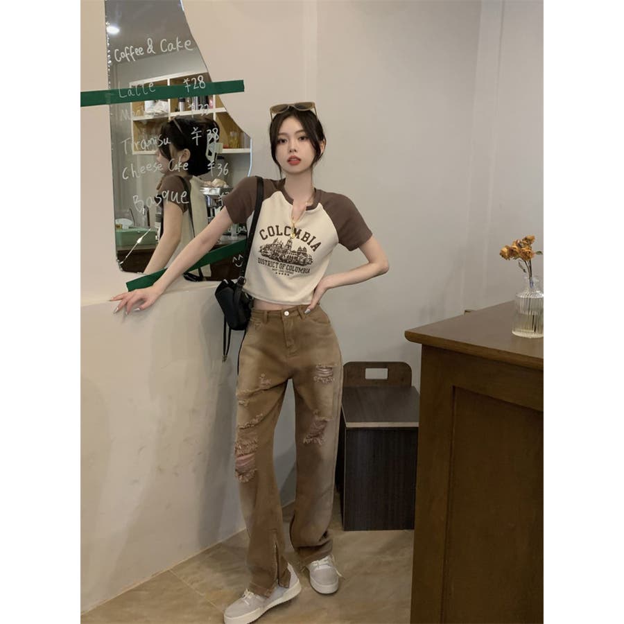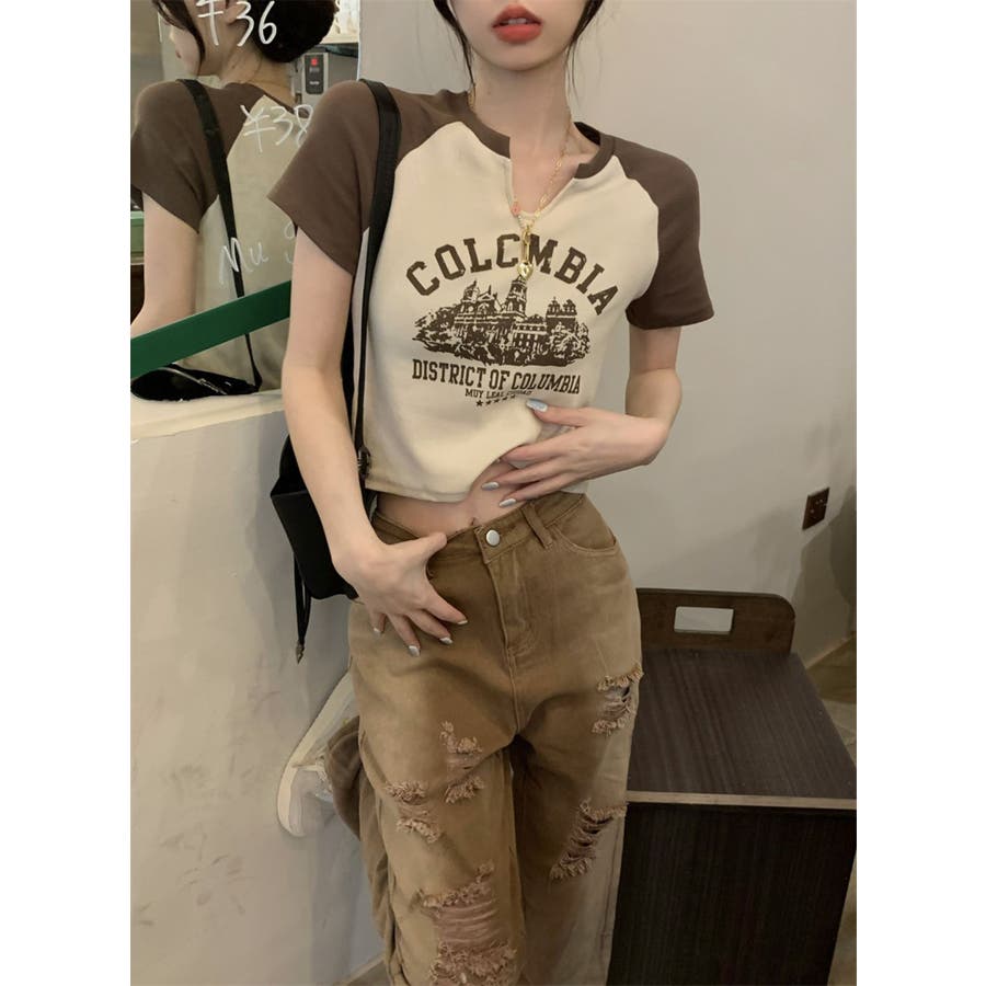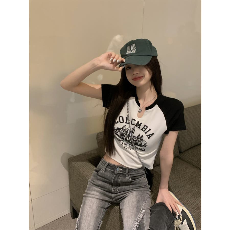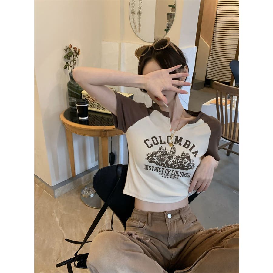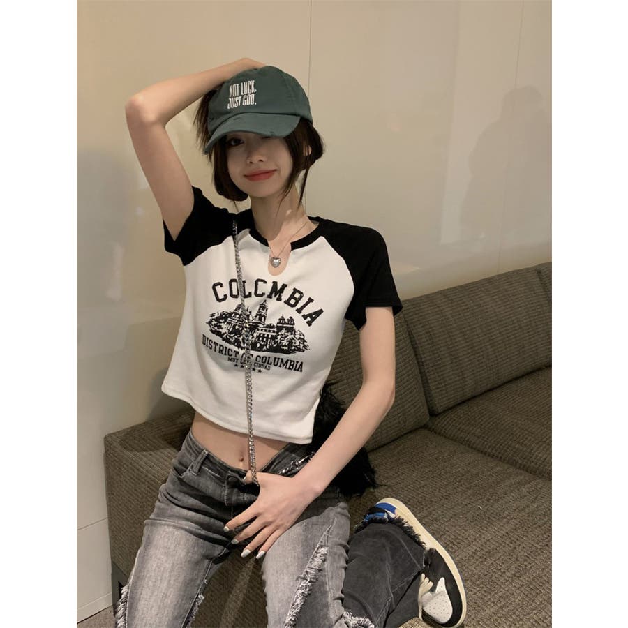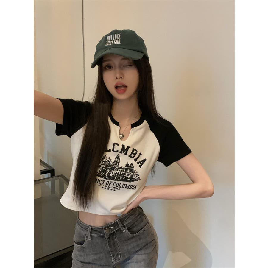 バイカラーラグランロゴプリントTシャツ/クロップドTシャツ