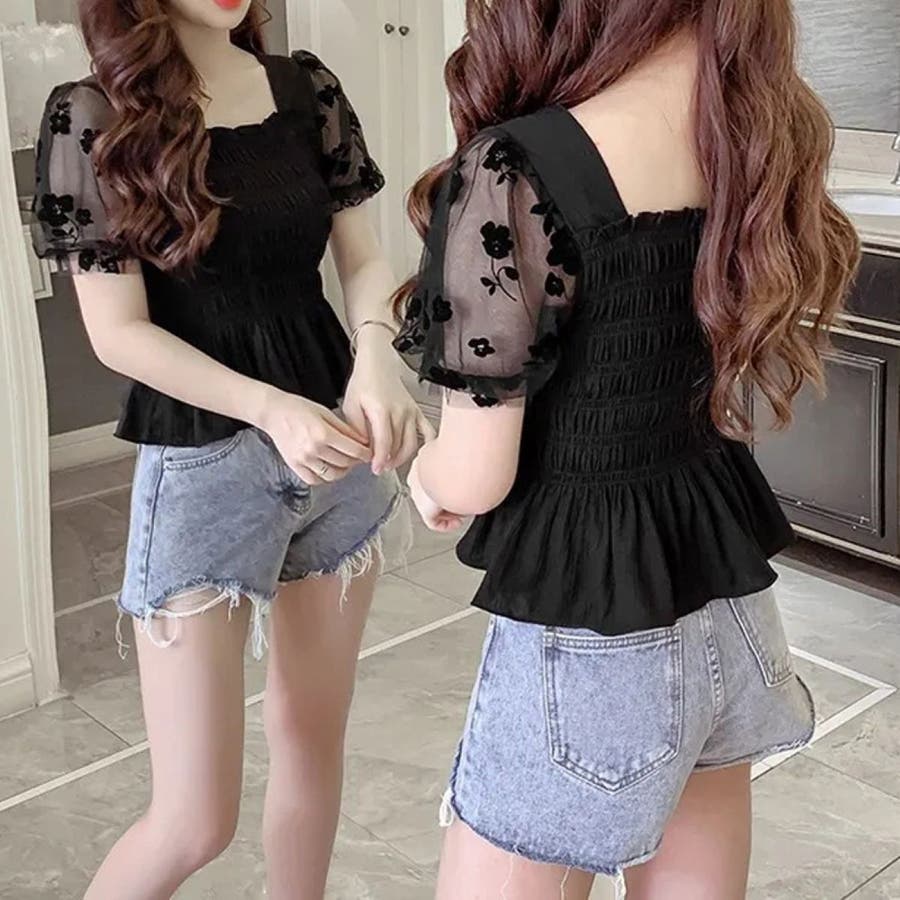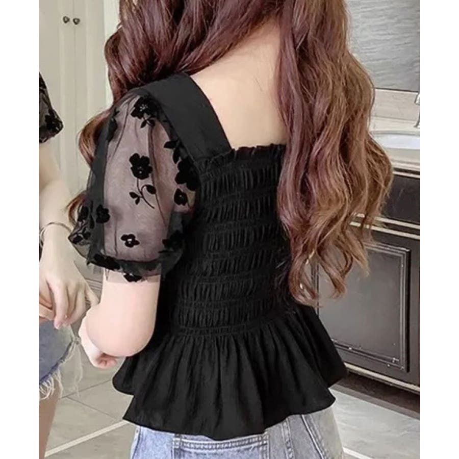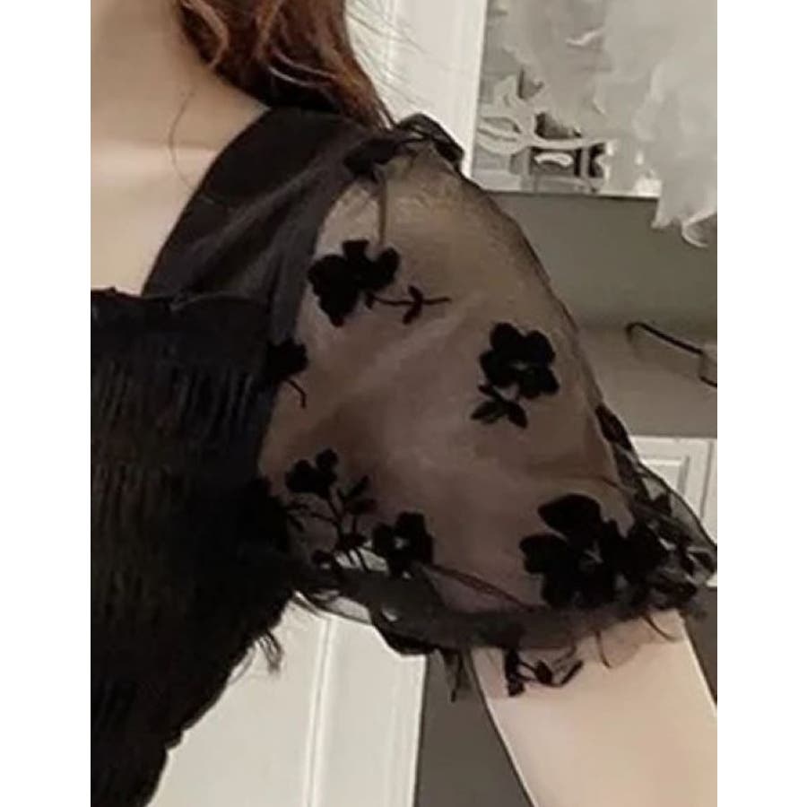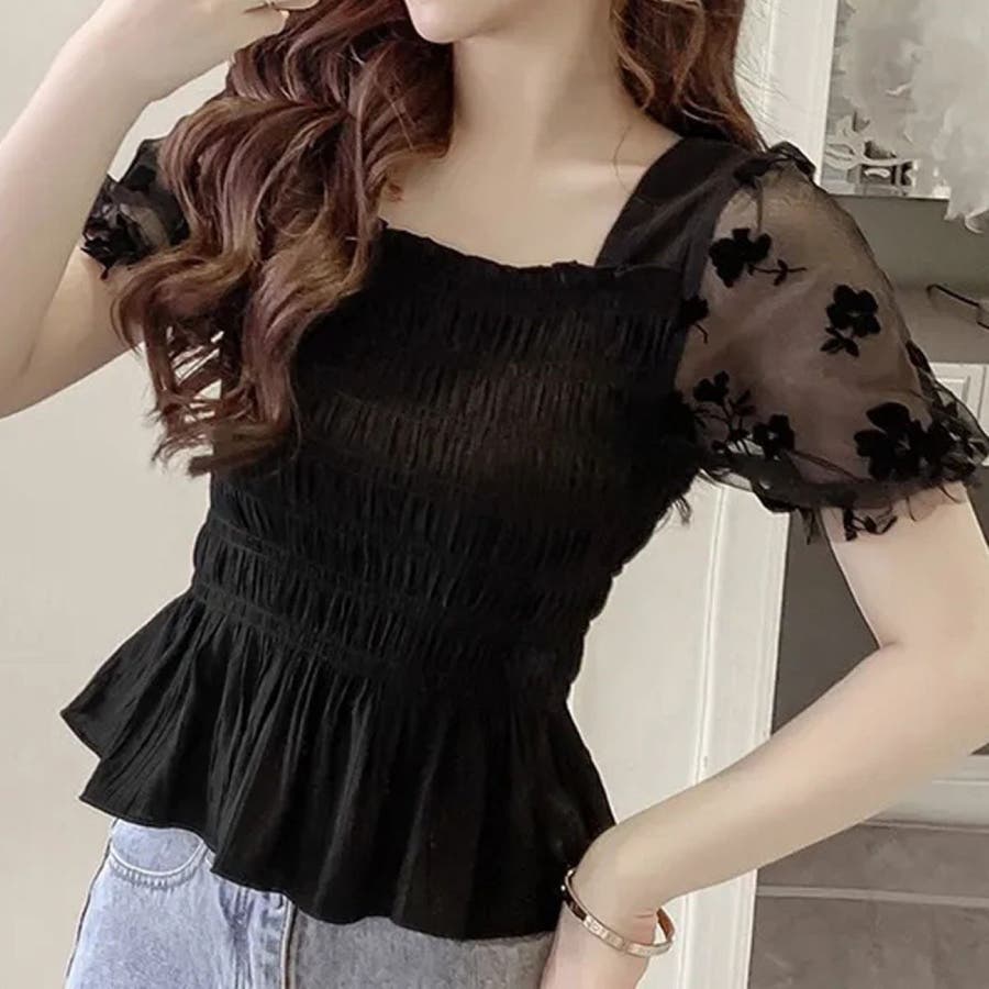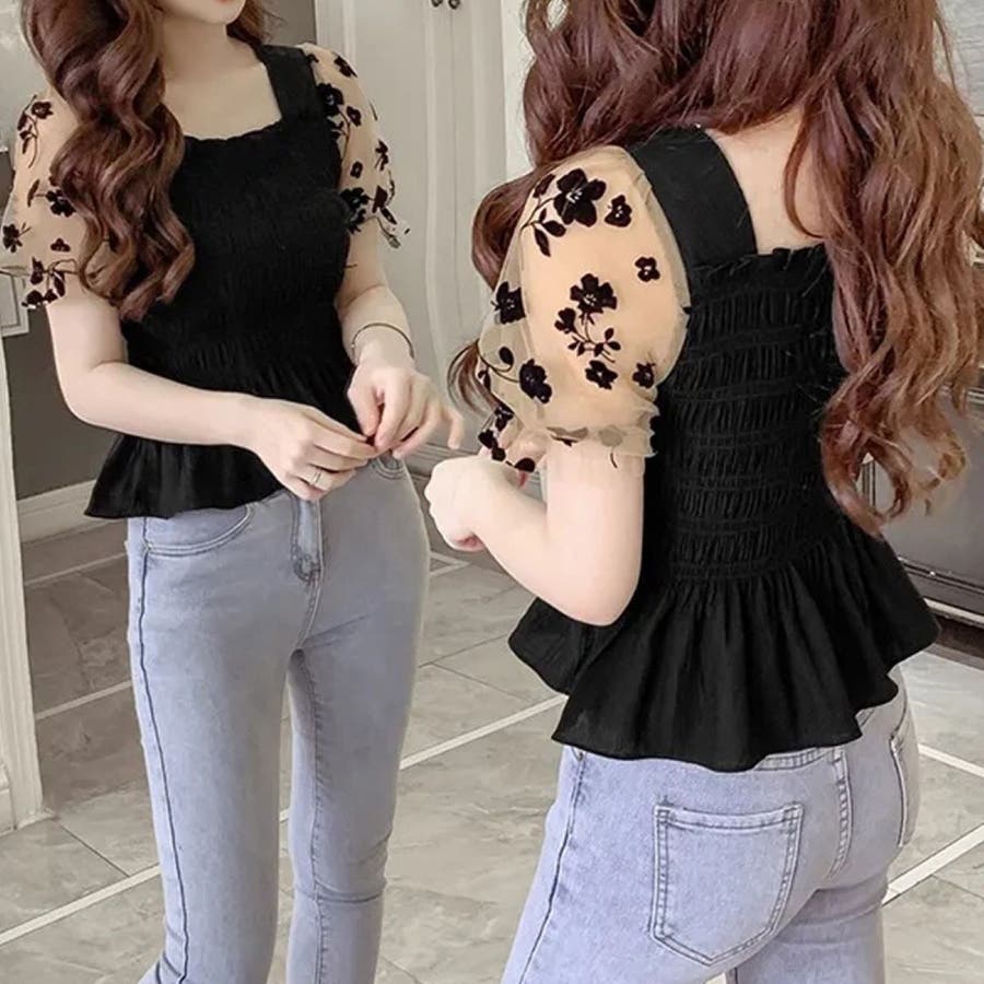 花柄シフォンの袖がかわいいシャーリングトップス