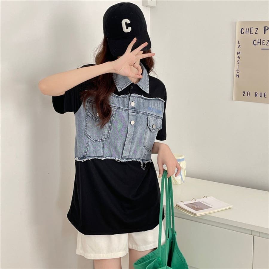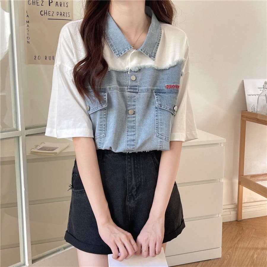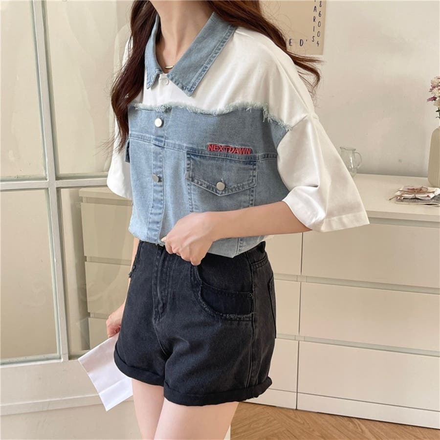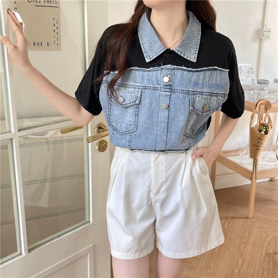 トップス デニム使い レディース 半袖 カジュアル キレイめ ヘビロテ トレンド トップス セクシー 着痩せ コスパ おしゃれ お出かけ デート 普段着 普段使い 大人かわいい 着回し 高見え 夏