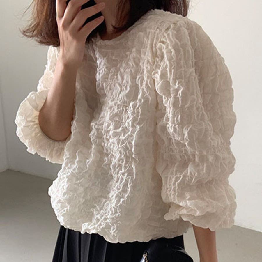 ワッフル風変わり織プルオーバーブラウス/袖口ゴム/ボリューム袖