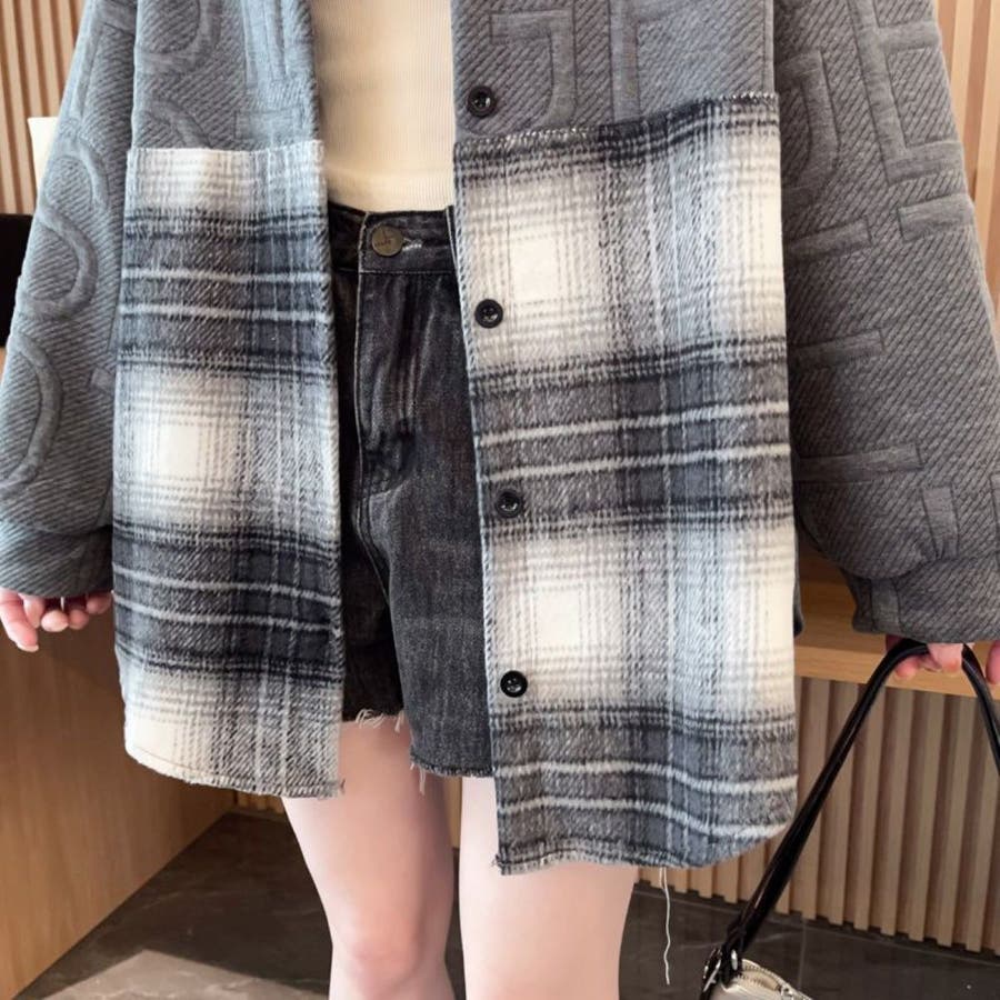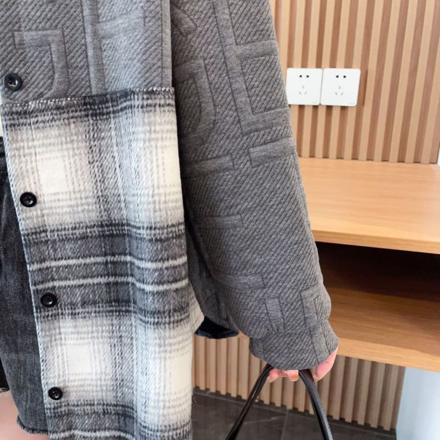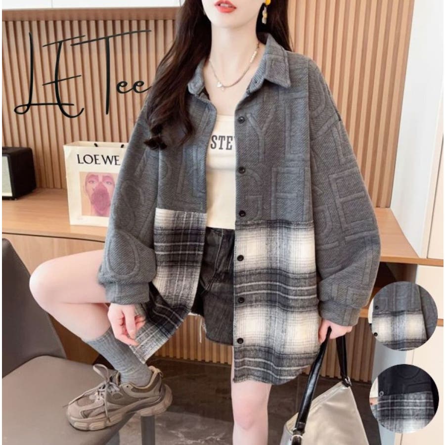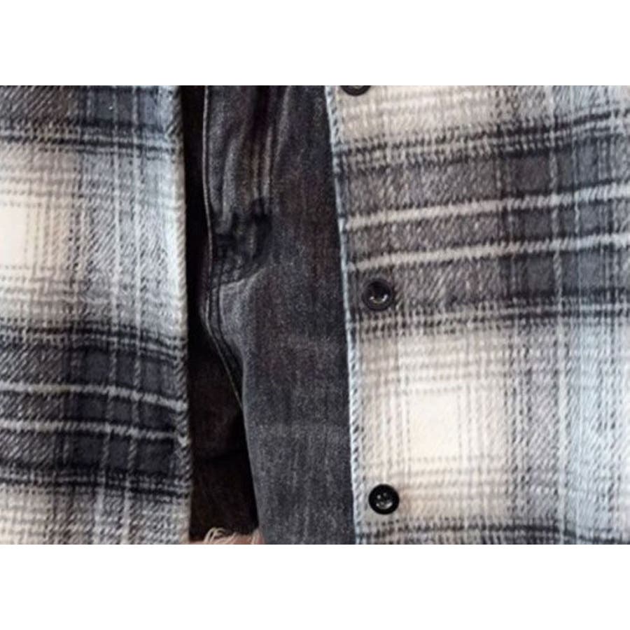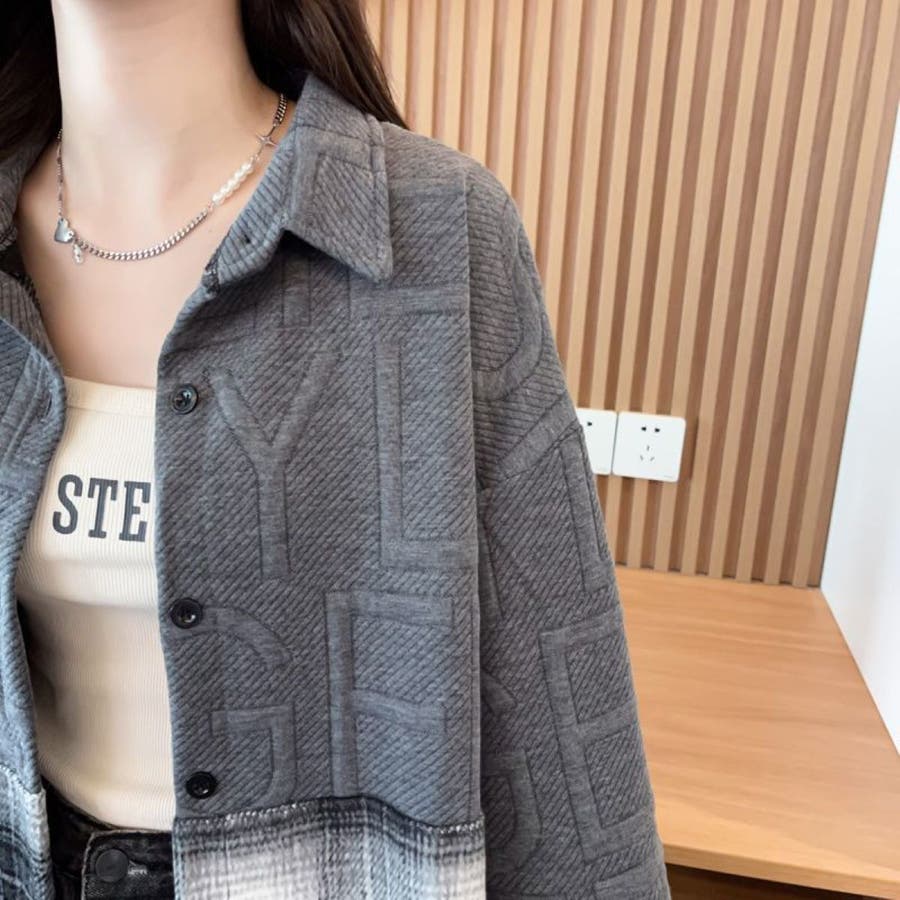 異素材ドッキングビッグシャツ/チェック柄/英字ジャカード