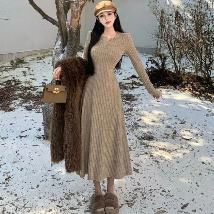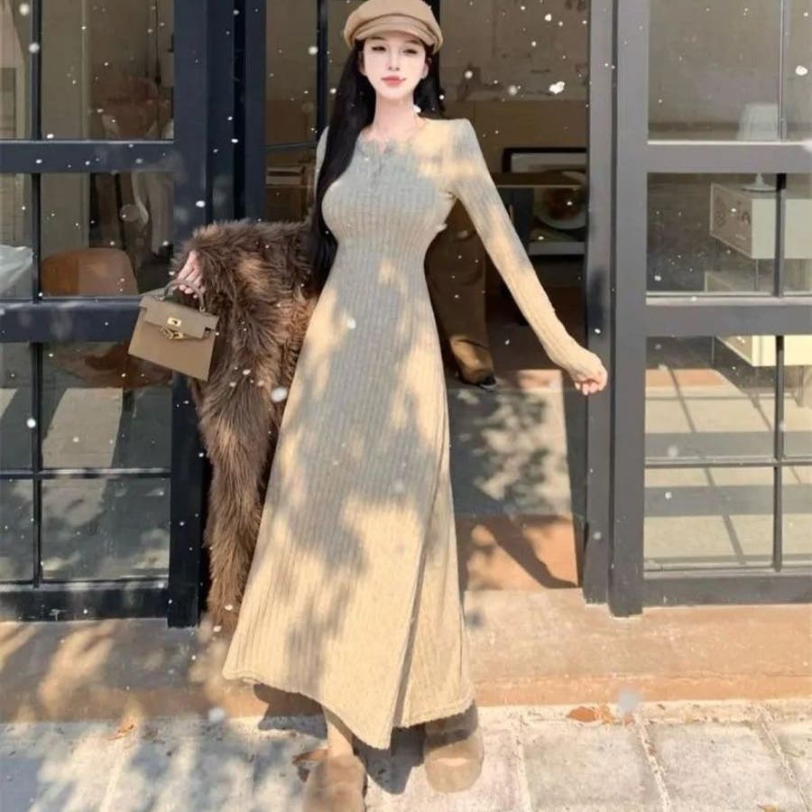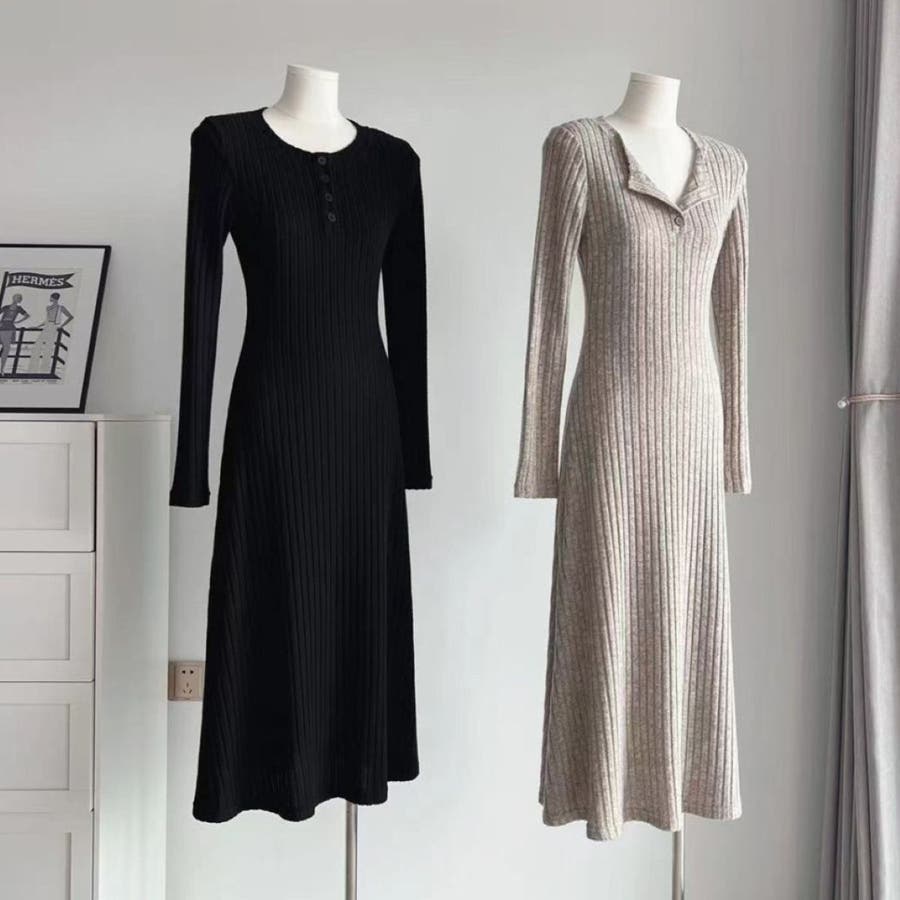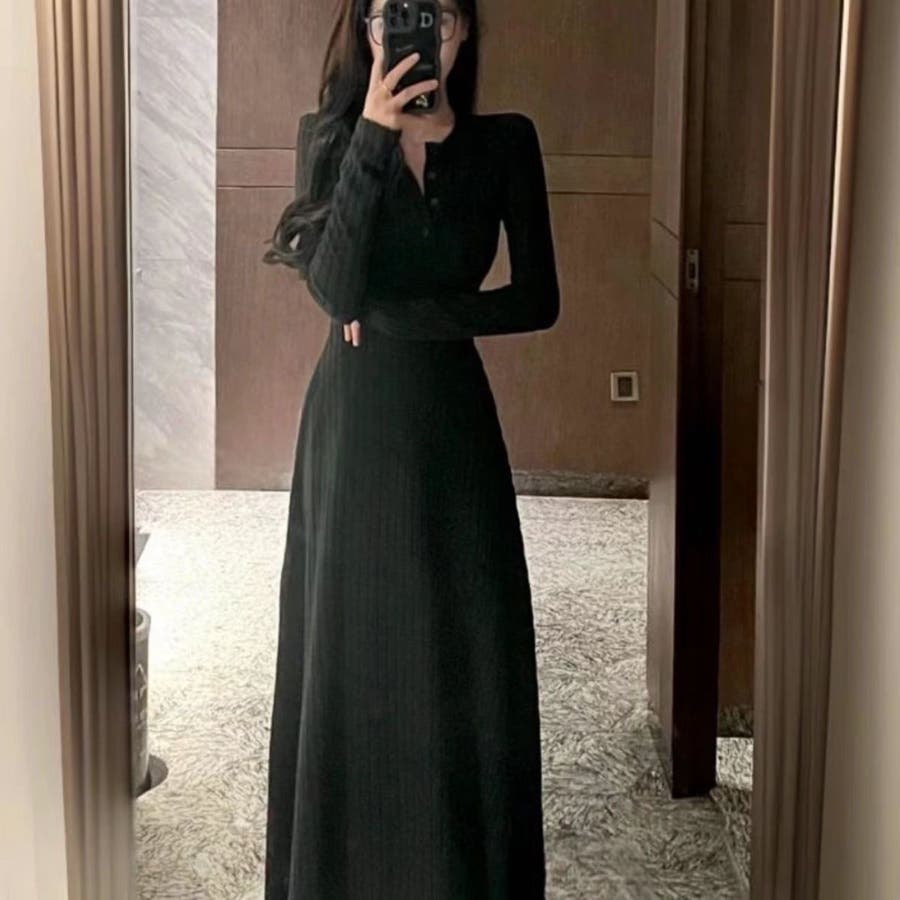 カットソーワンピース Aライン ヘンリーネック ロングワンピース 韓国ファッション 韓国 大人スタイル オフィスカジュアル インスタグラム インスタ映え 秋 秋服 冬 冬服 LT259402