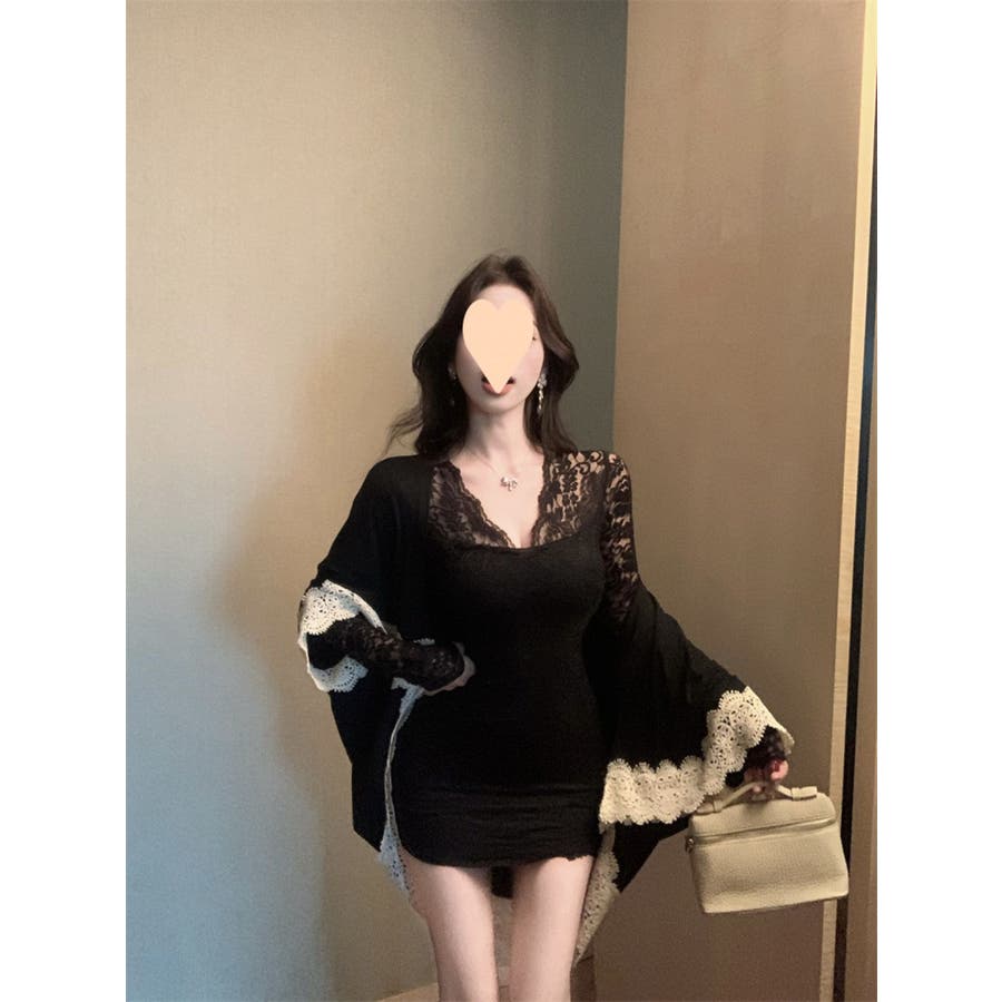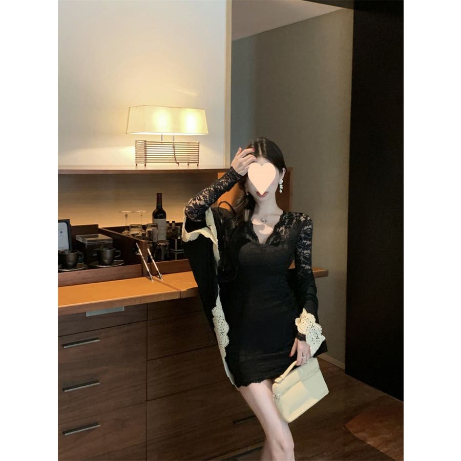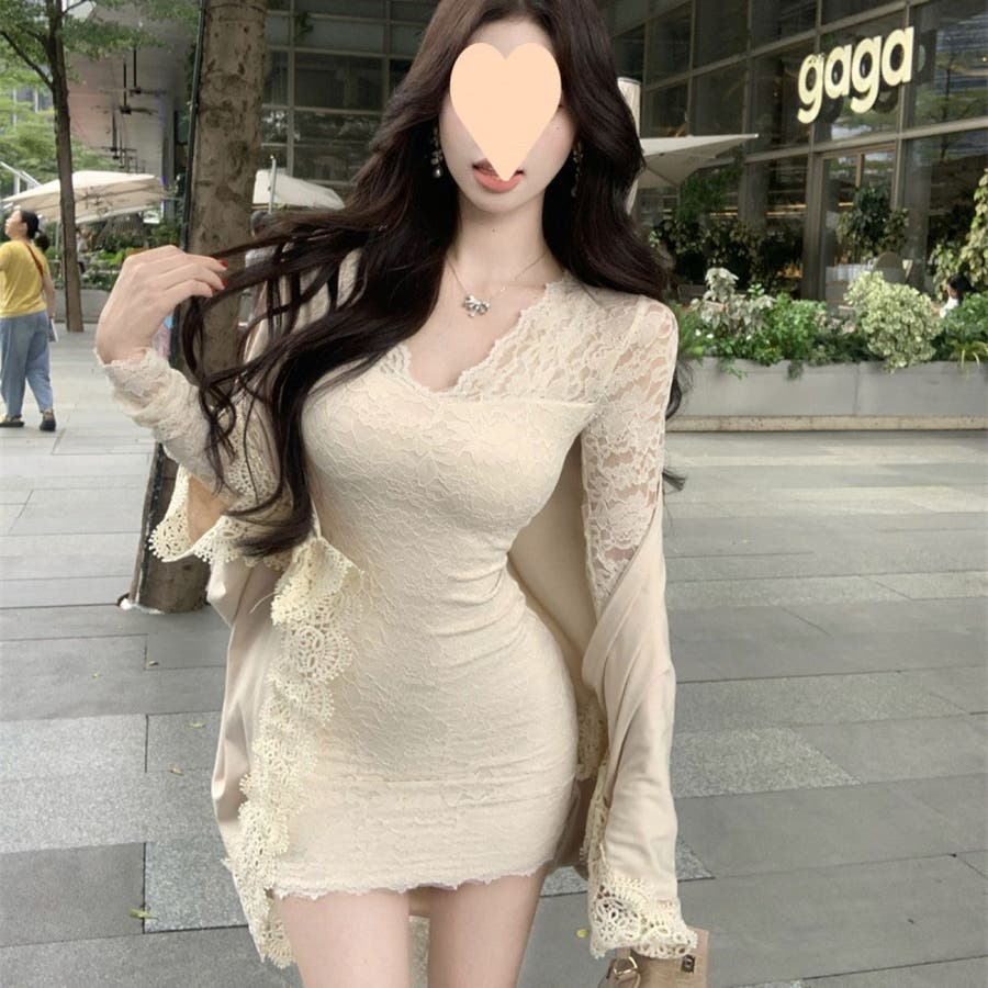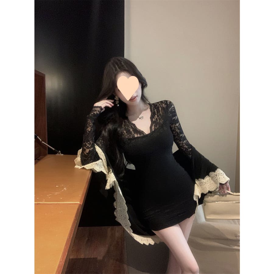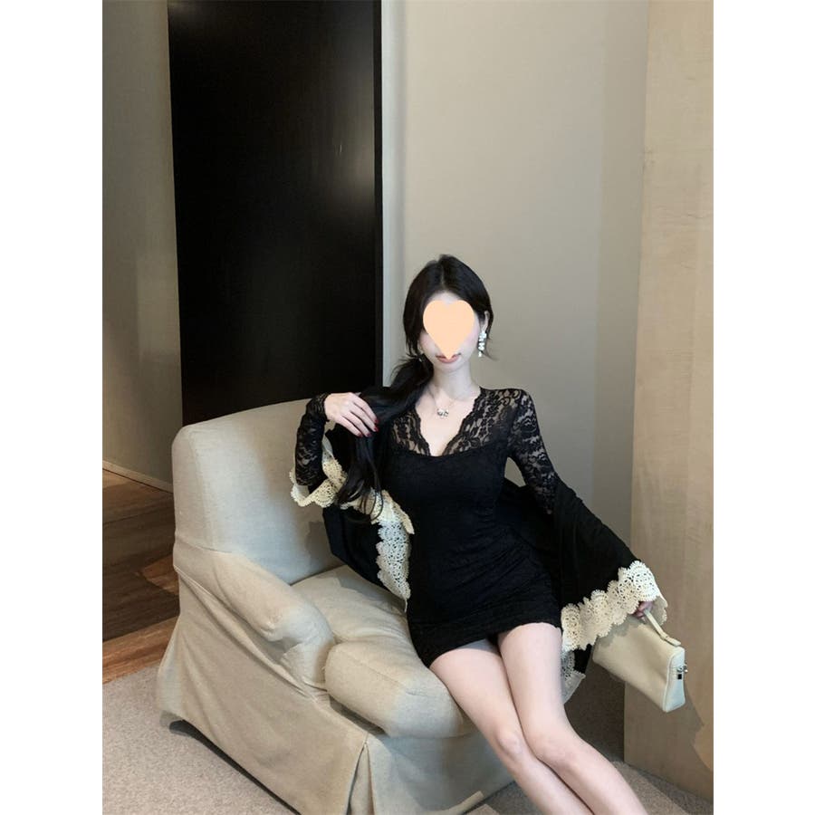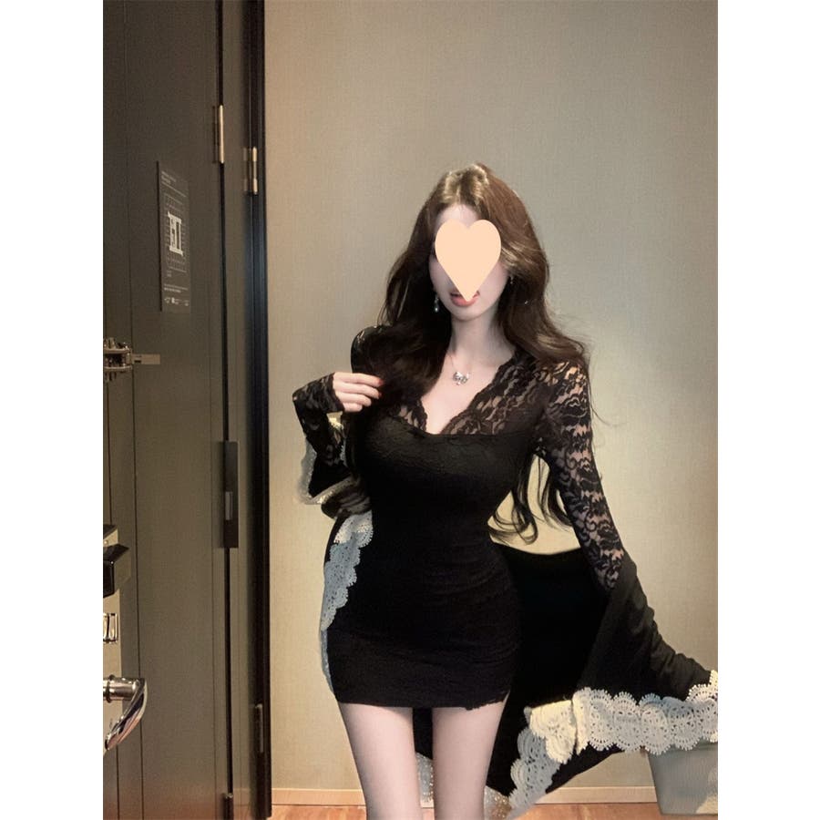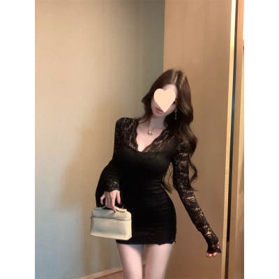 レースワンピース ミニ丈 韓国ファッション レディース Vネックワンピ 韓国 大人スタイル セクシー デート ボディーライン インスタグラム インスタ映え 秋 秋服 冬 冬服 LT259406