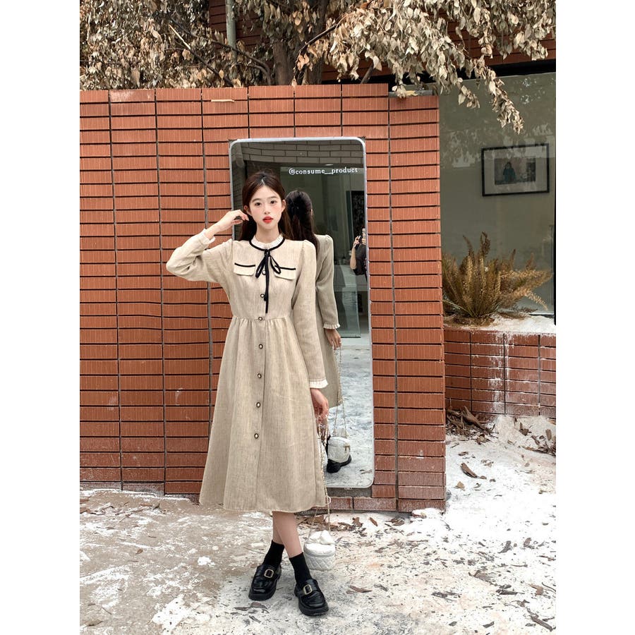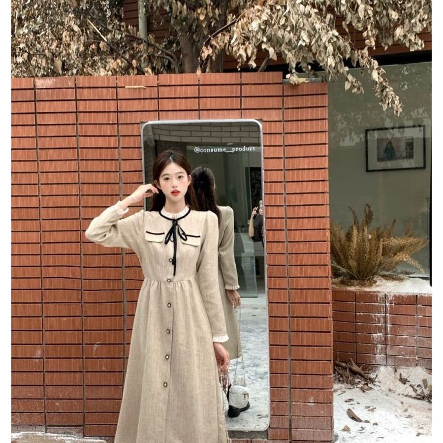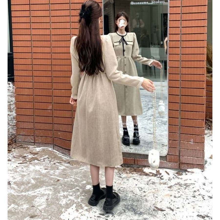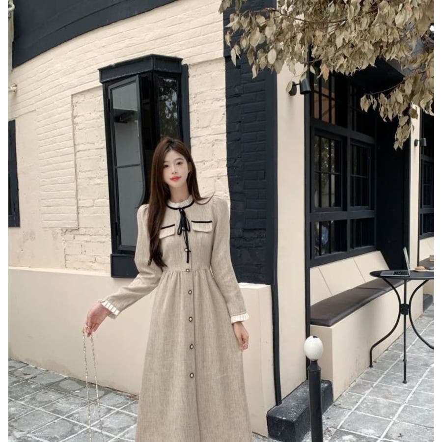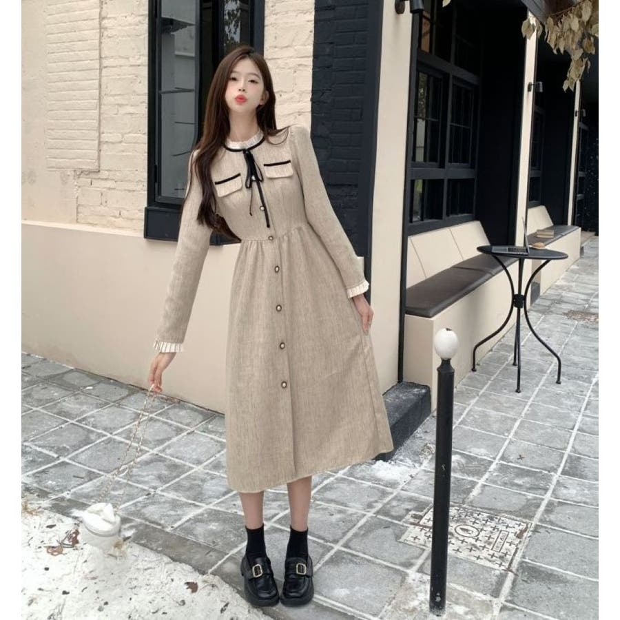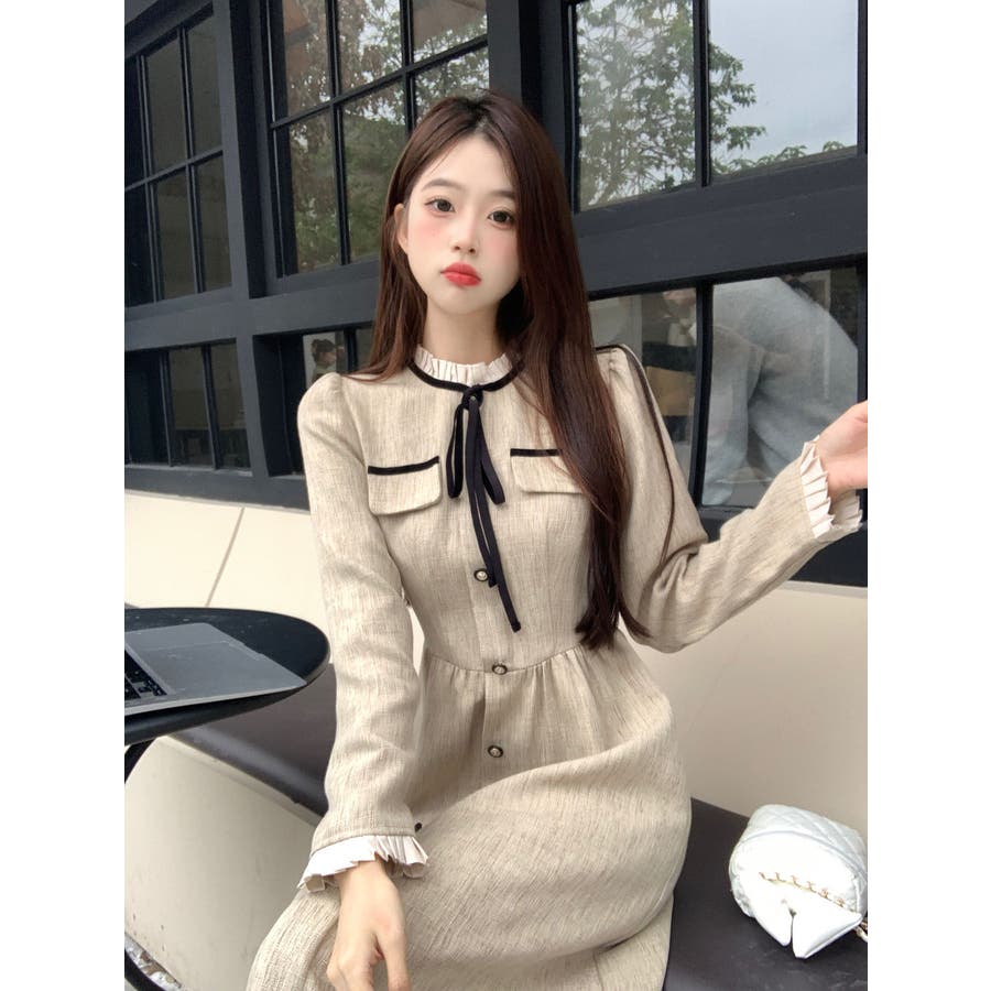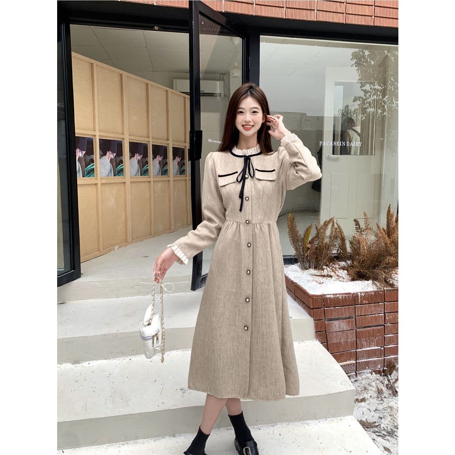 ワンピース スタンドカラー フリル ロングワンピース キュート 韓国ファッション 韓国 大人スタイル 袖口フリル Aライン ウエスト切替 高見え リボン 見せかけ胸ポケット インスタグラム インスタ映え 秋 秋服 冬 冬服 LT259407