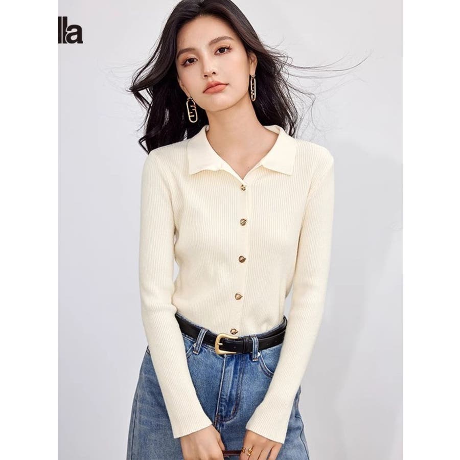 メタルリングボタンエリツキカーディガン/柔らかリブニット