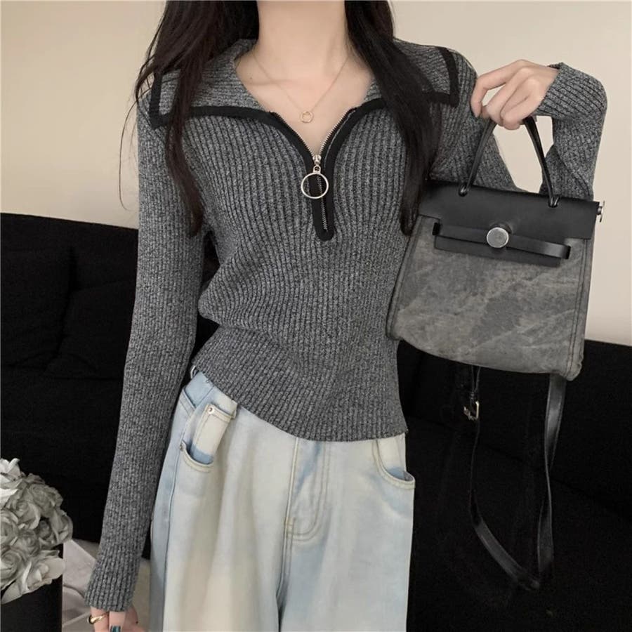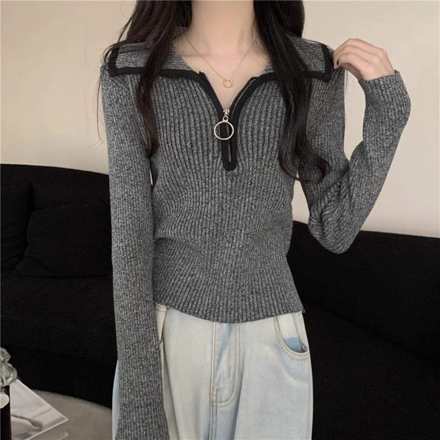 ハーフジップえりつきニットプルオーバー/リングスライダー/トリミングカラー