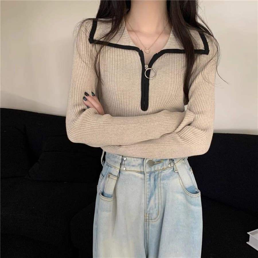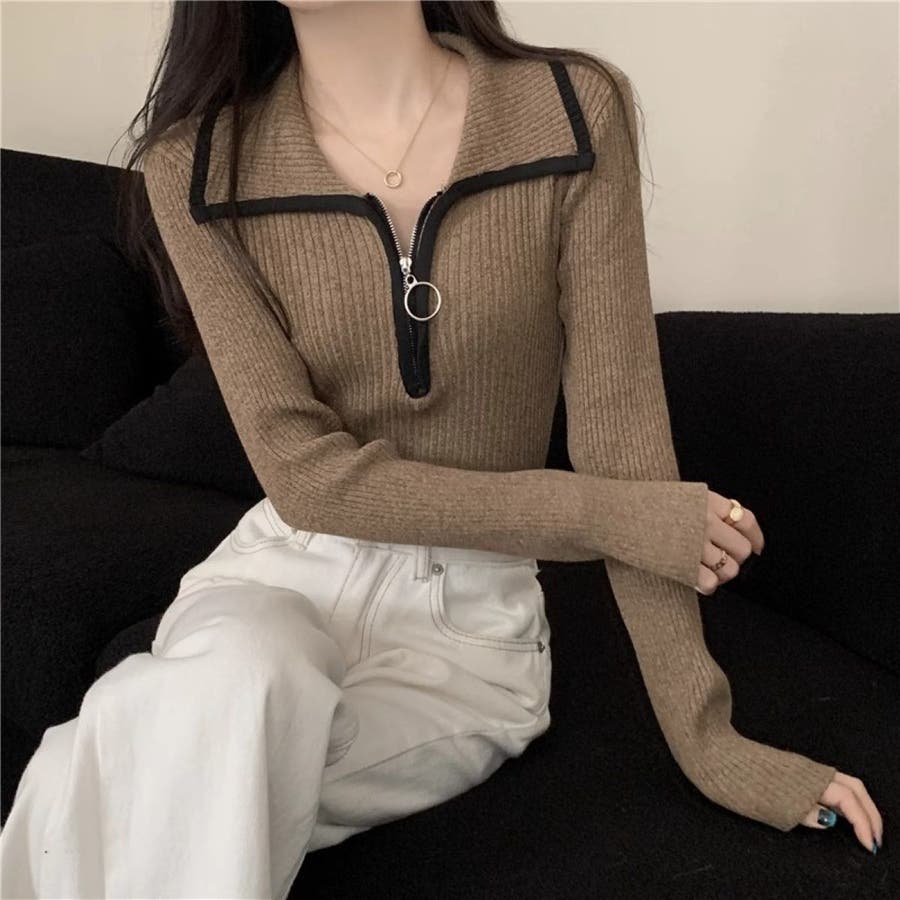 レディース ハーフジッププルオーバー トリミングカラー 配色えり付き ニット 長袖 大人かわいい ヘビロテ トレンド 韓国ファッション 着痩せ コスパ おしゃれ お出かけ デート 休日コーデ 普段使い かわいい 着回し 高見え インスタグラム インスタ映え 秋 秋服 冬 冬服 LT259606