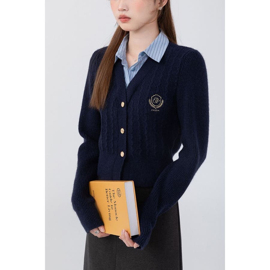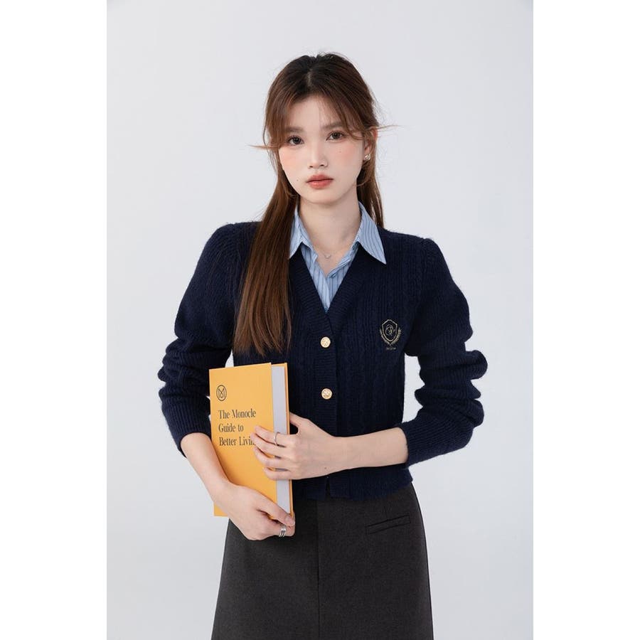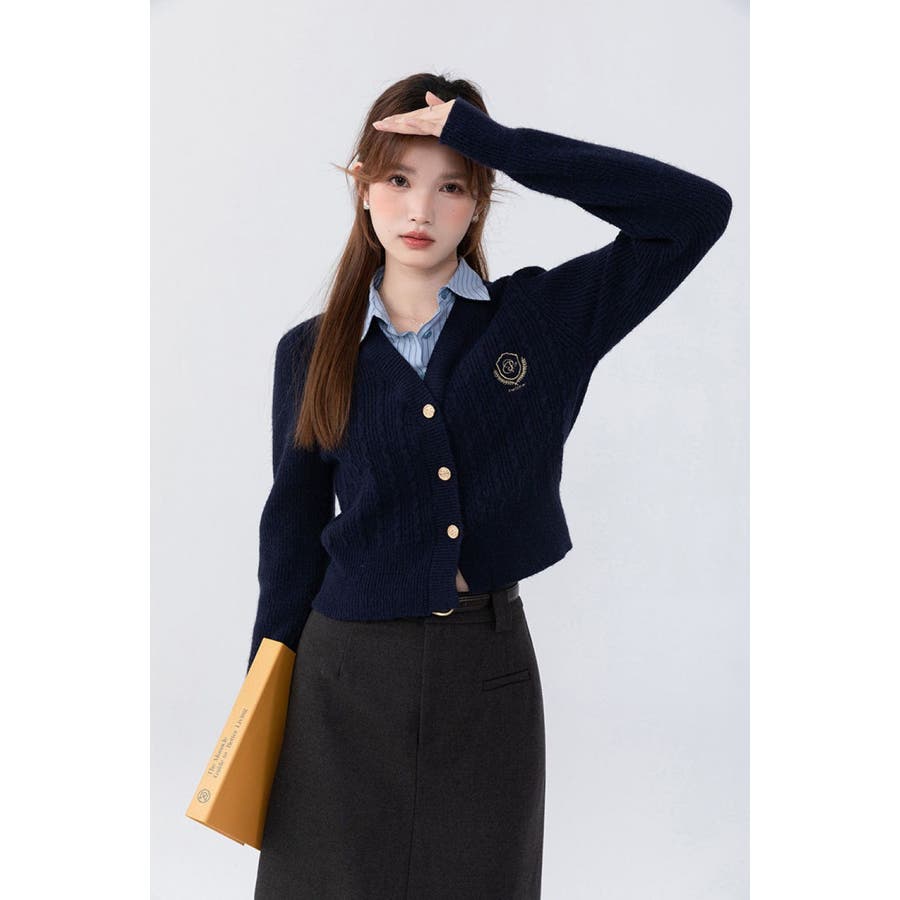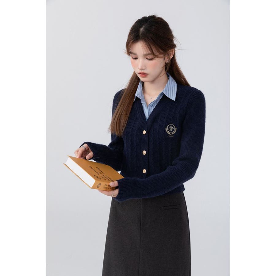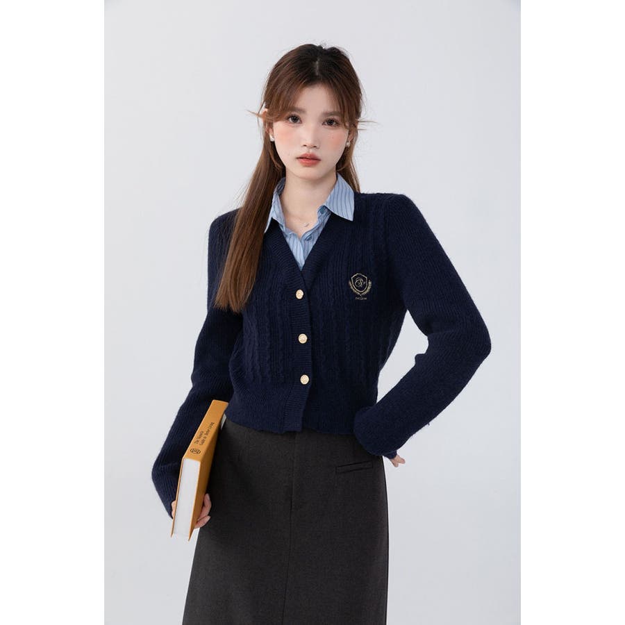 ニットトップス/見せかけえり付き/エンブレム風ワンポイント刺繍