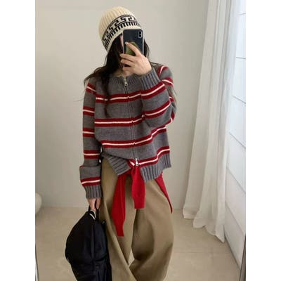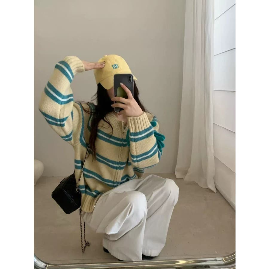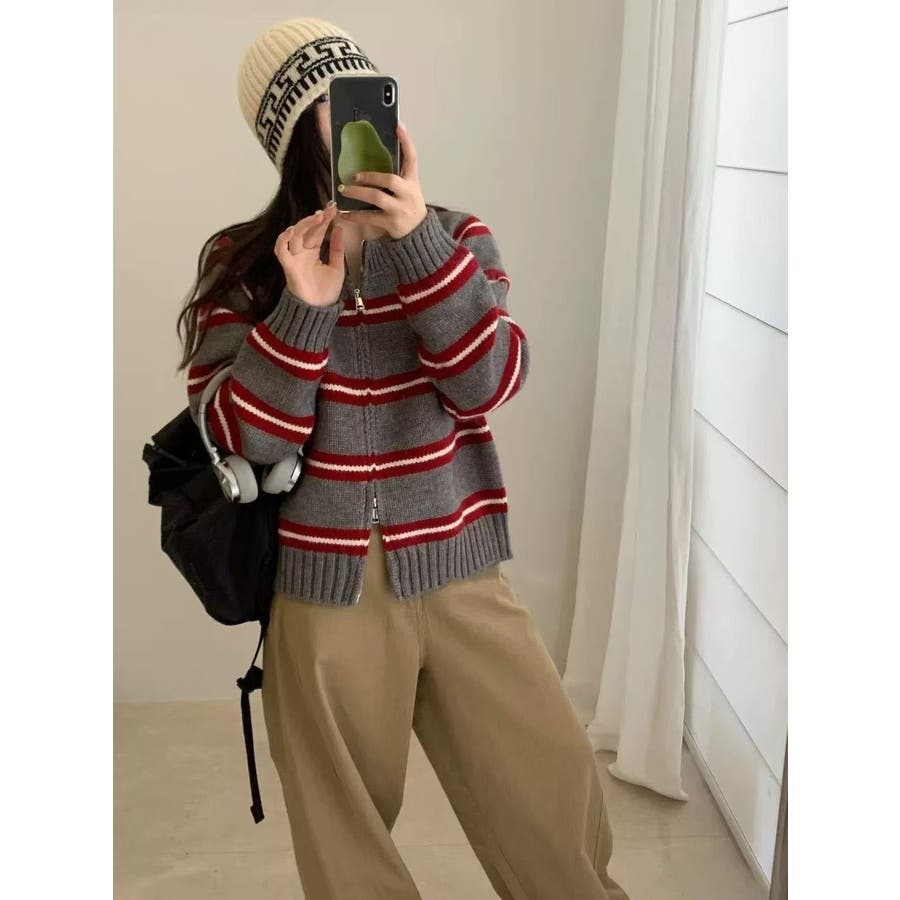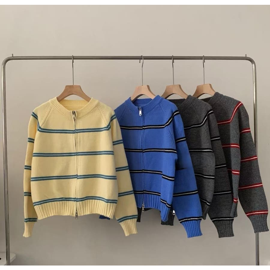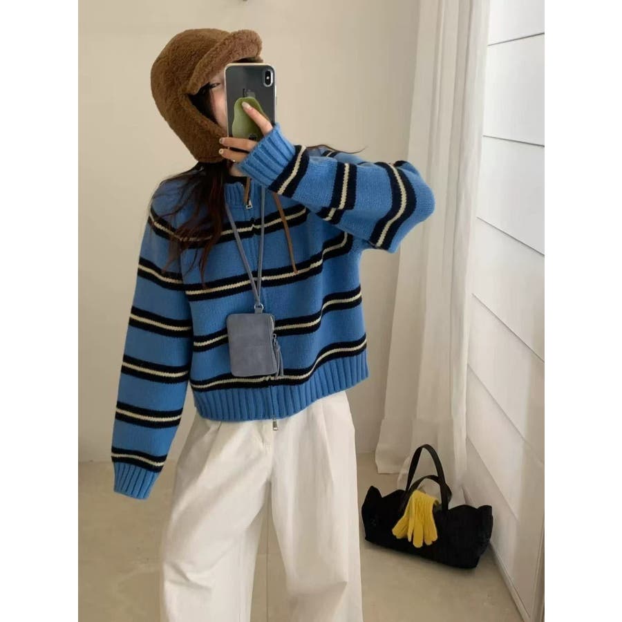 ボーダーニット ダブルジップカーデ 配色ボーダー クルーネック 韓国ファッション レディース 長袖 シンプル トレンド トップス 韓国ファッション 着痩せ コスパ おしゃれ お出かけ デート 普段着 普段使い きれいめ かわいい 着回し 高見え 秋 秋服 冬 冬服 LT25A601