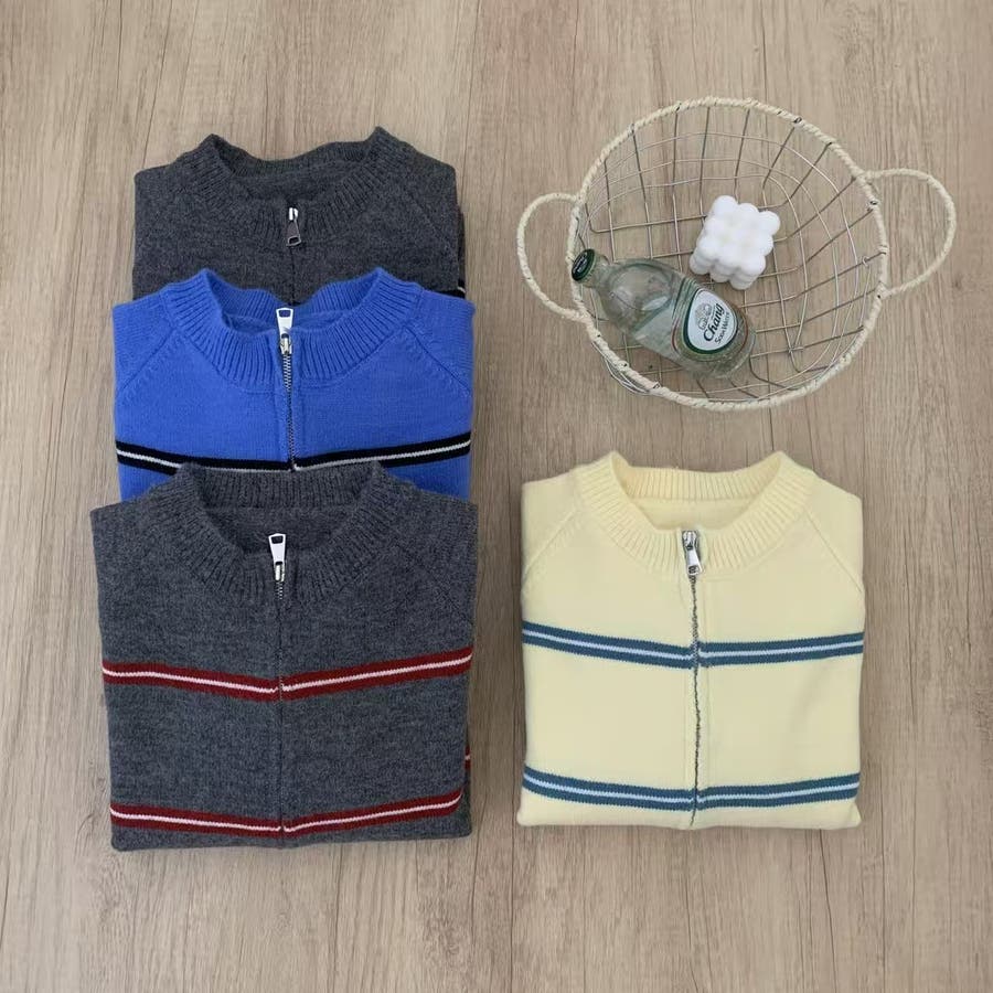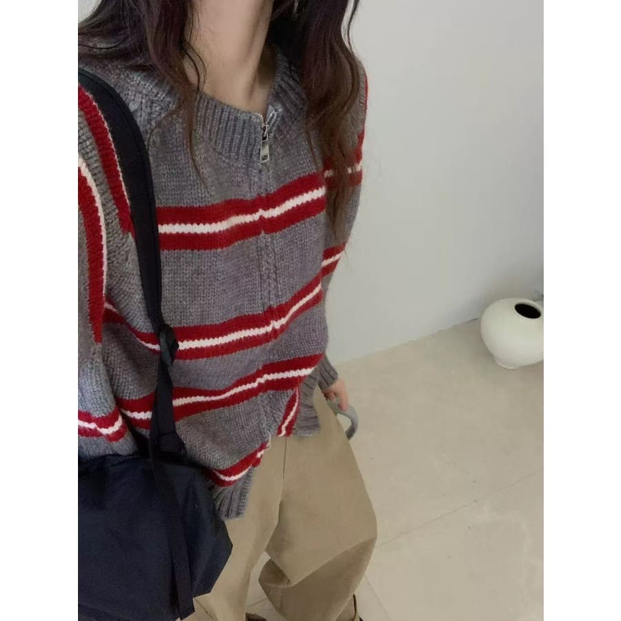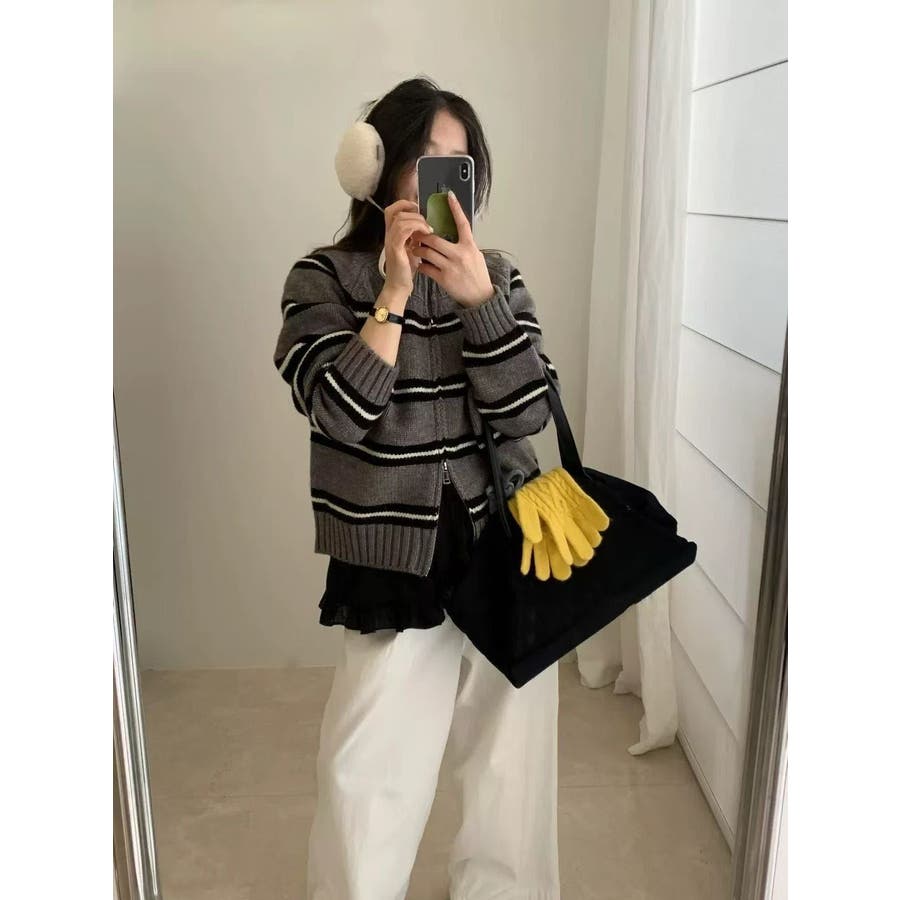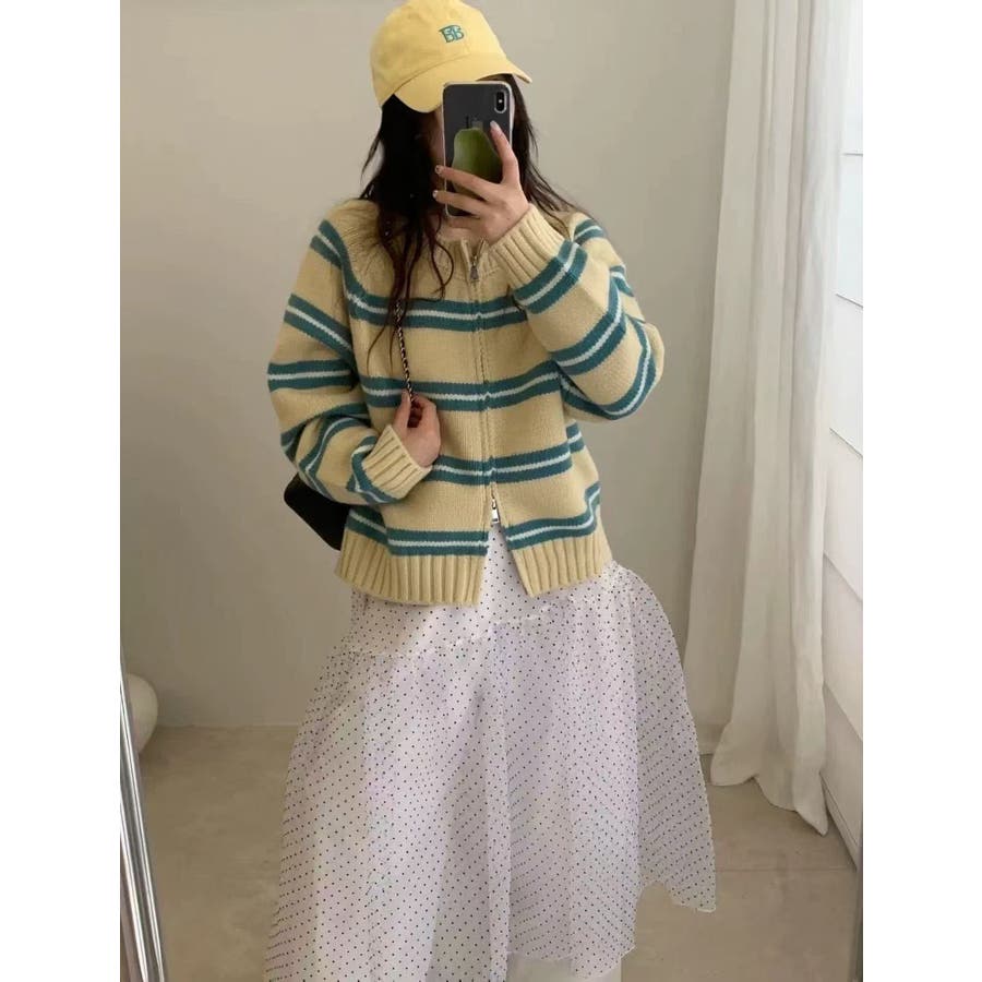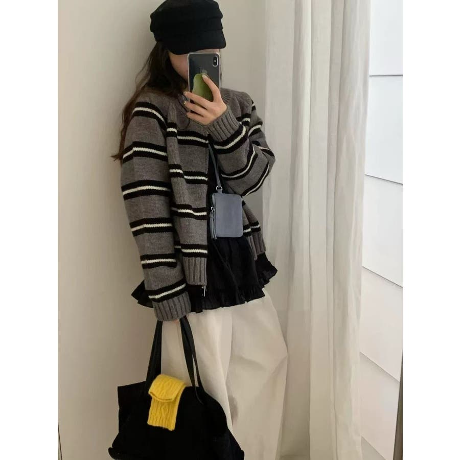 ボーダーニット ダブルジップカーデ 配色ボーダー クルーネック 韓国ファッション レディース 長袖 シンプル トレンド トップス 韓国ファッション 着痩せ コスパ おしゃれ お出かけ デート 普段着 普段使い きれいめ かわいい 着回し 高見え 秋 秋服 冬 冬服 LT25A601