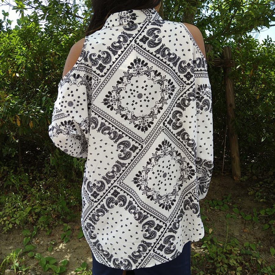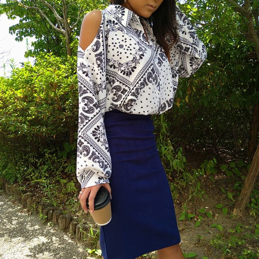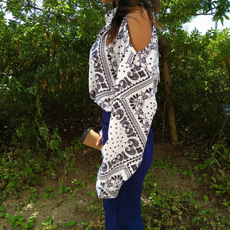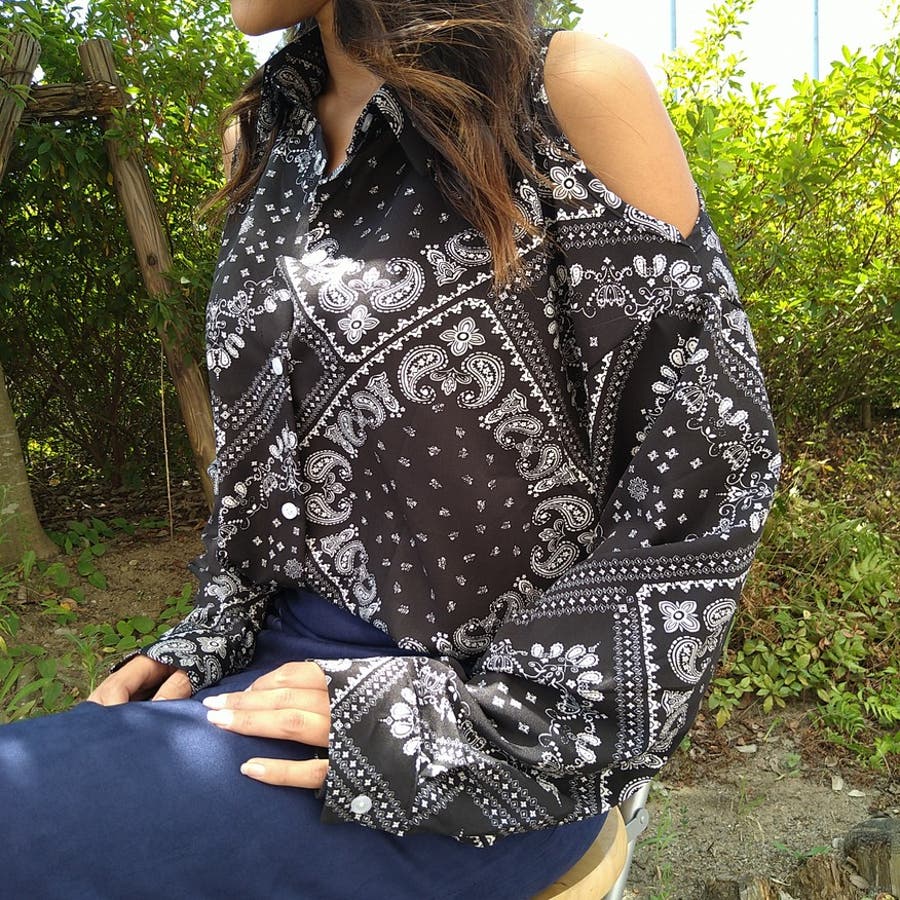 大き目バンダナ柄がインパクトのあるビッグサイズシャツです!人気のオープンショルダーでトレンド感もバッチリ♪着丈も長めに作られていますので、ベルトを使ってブラウジングなど着方いろいろ▽