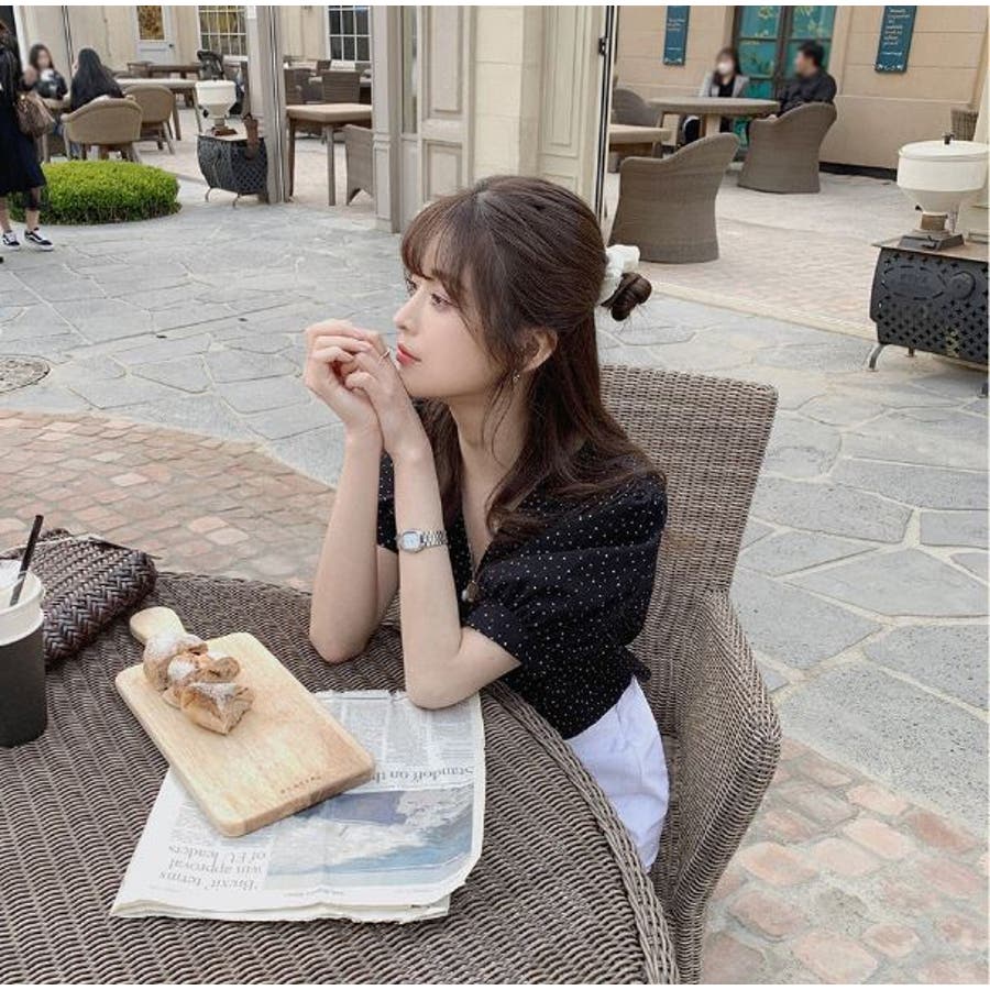 細かめのドット柄が優しいイメージ。ノーカラーなのも女の子らしい美デコルテを演出!