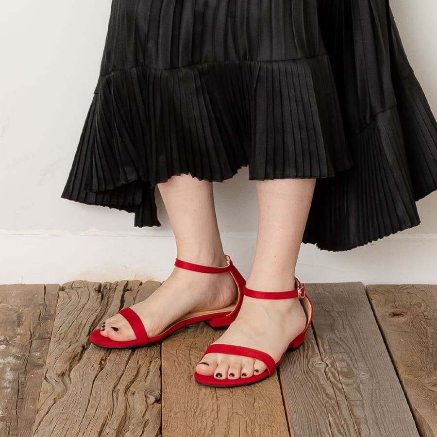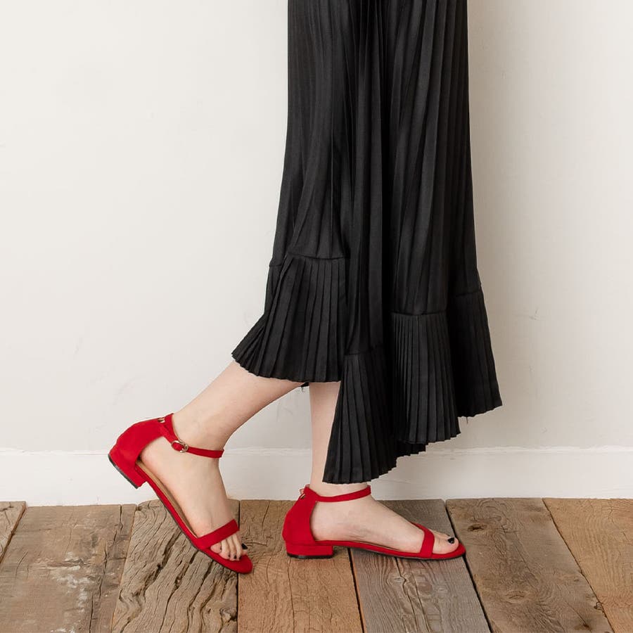 ヘルシーな肌見せ感と華奢なアンクルストラップが、大人の足元に品よく溶け込むポイントです。