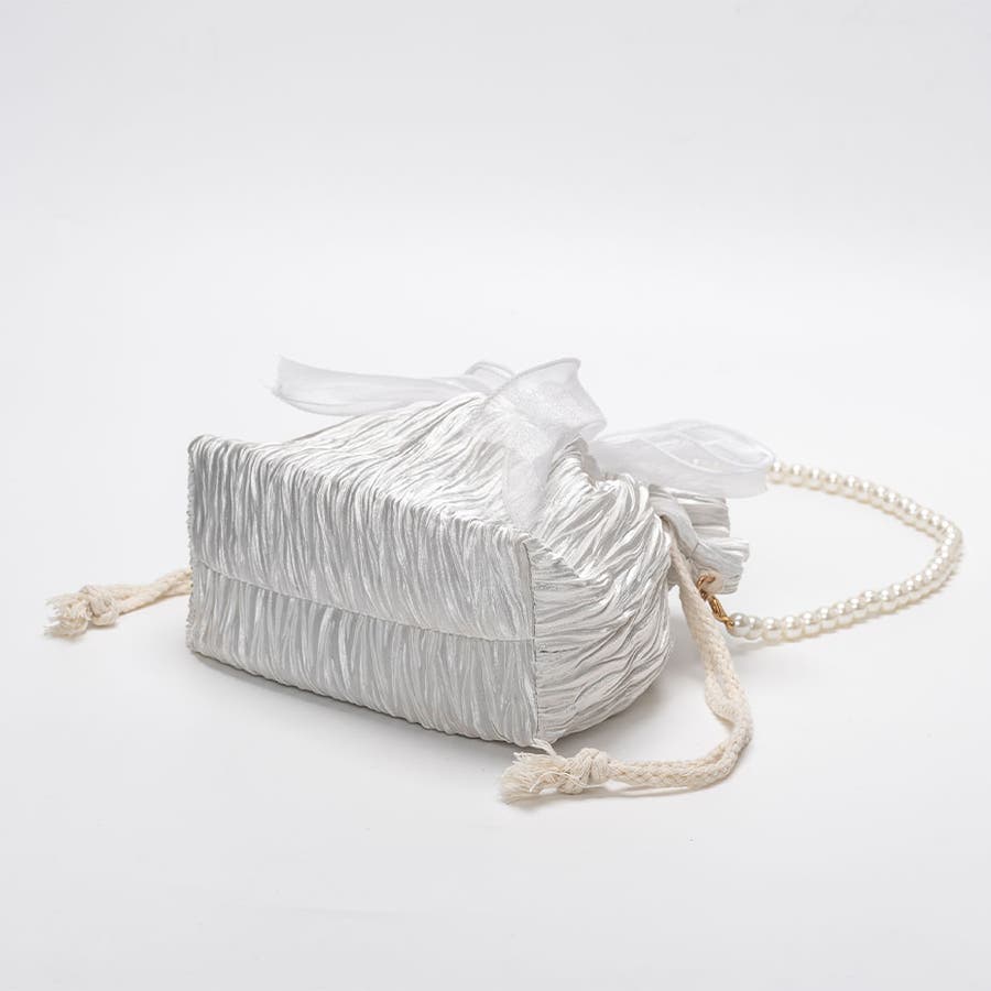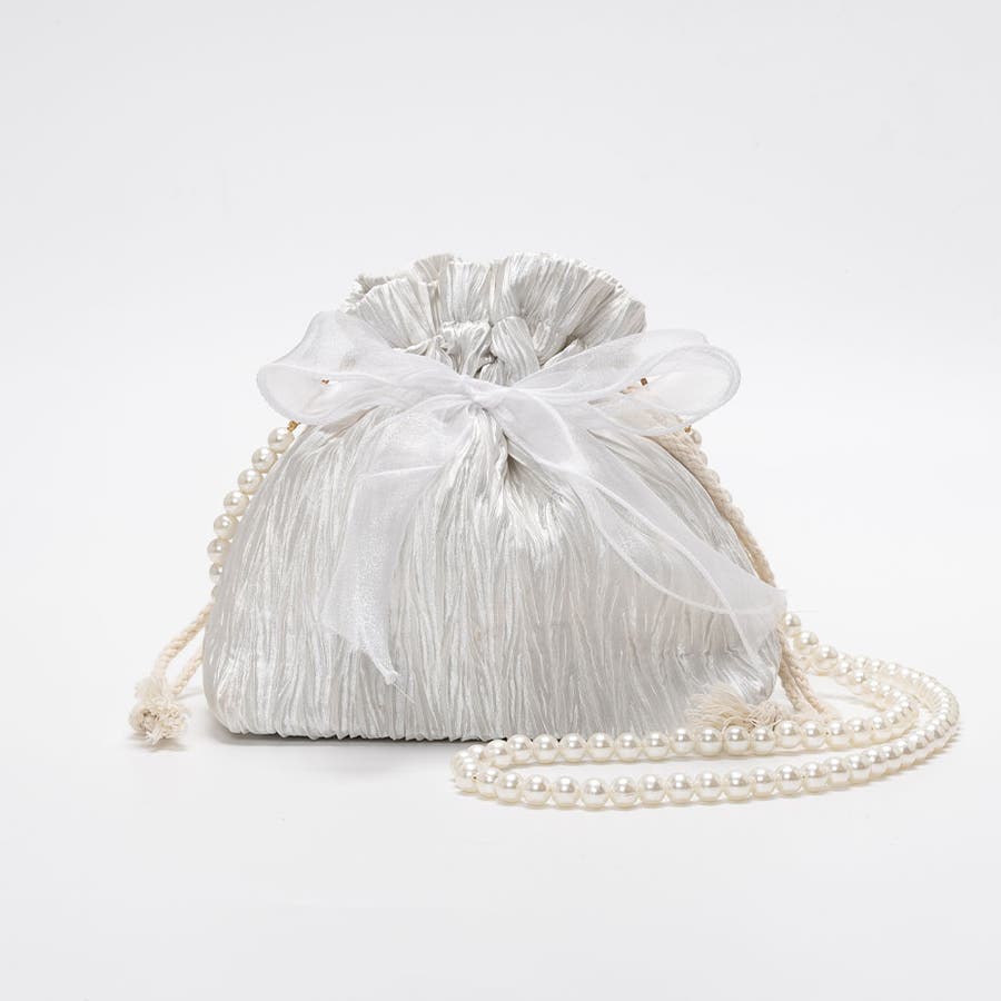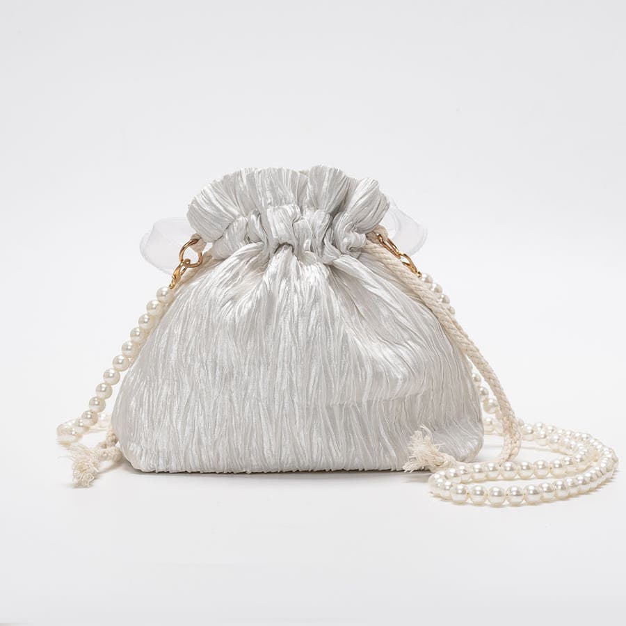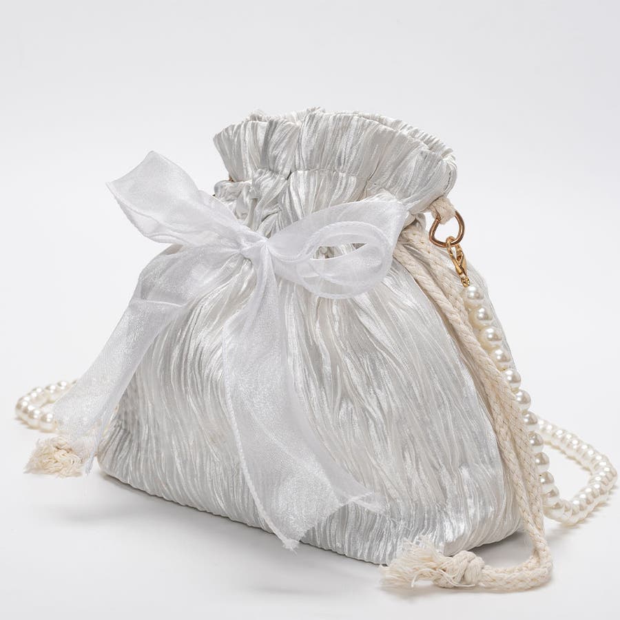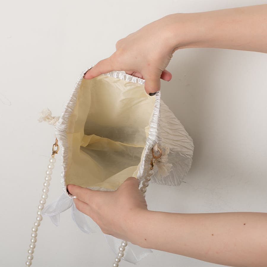 フェイクパール ショルダーストラップ リボン巾着バッグ。