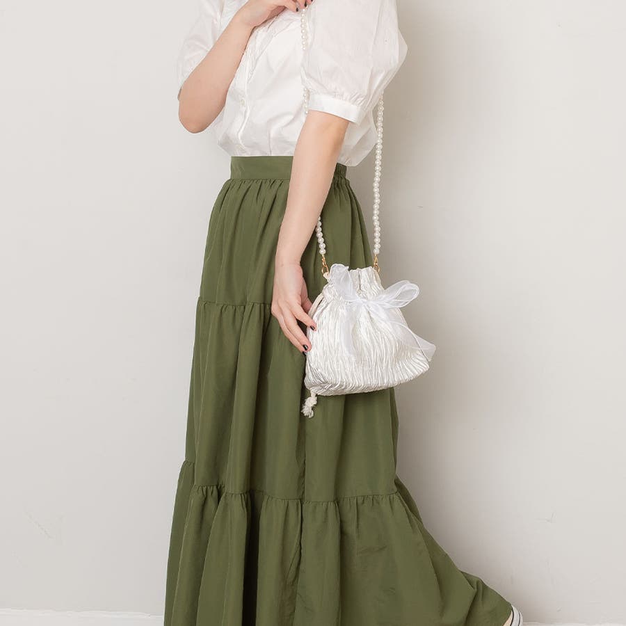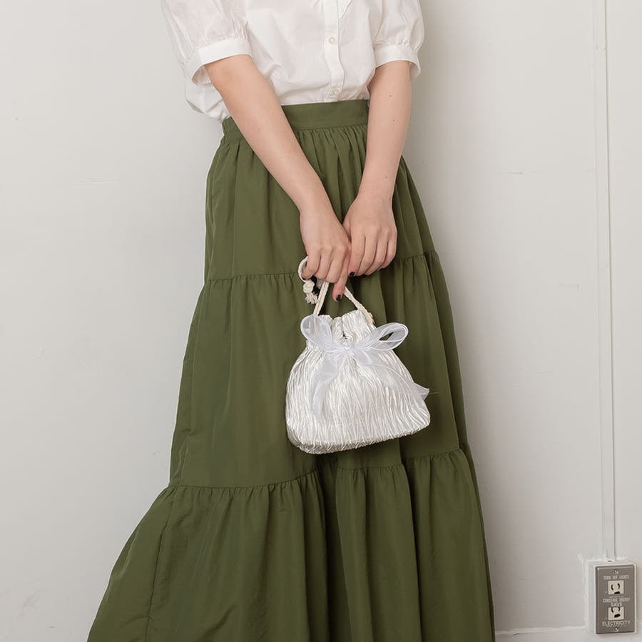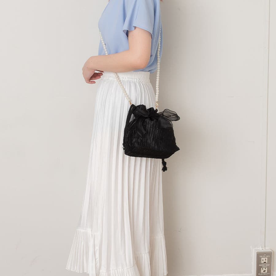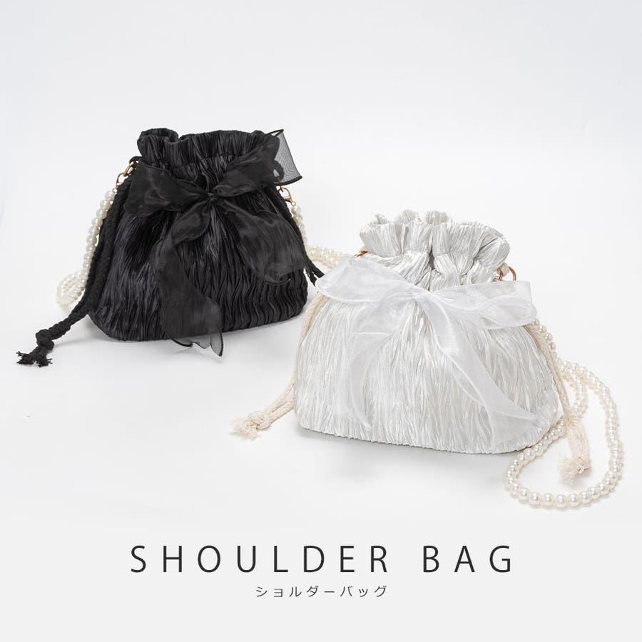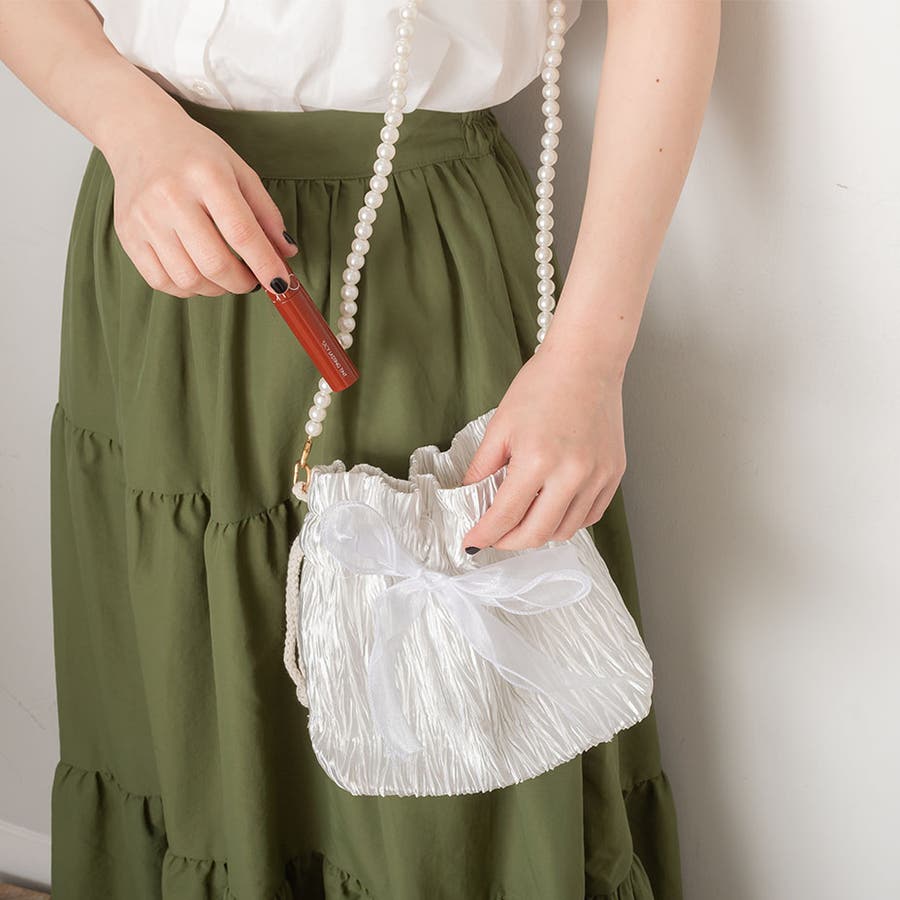 フェイクパール ショルダーストラップ リボン巾着バッグ。