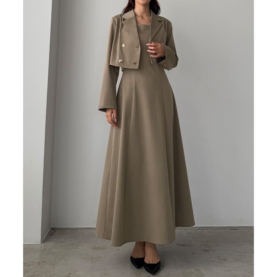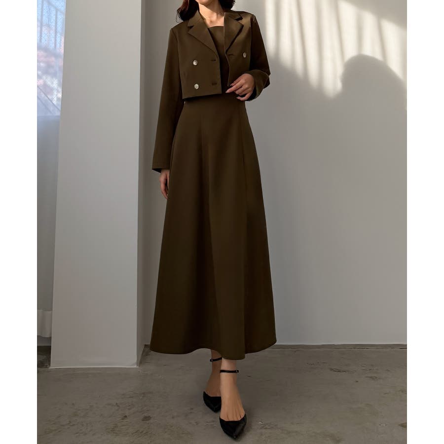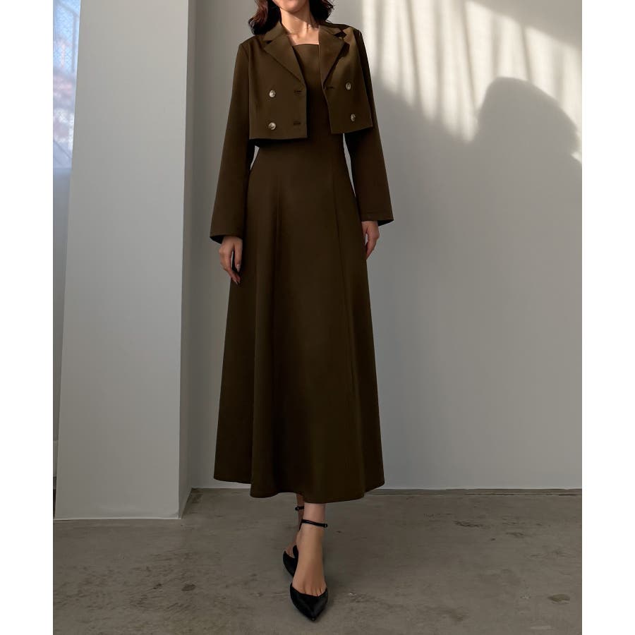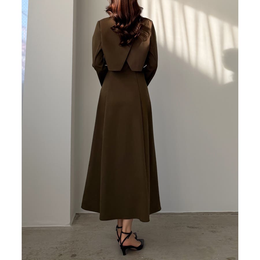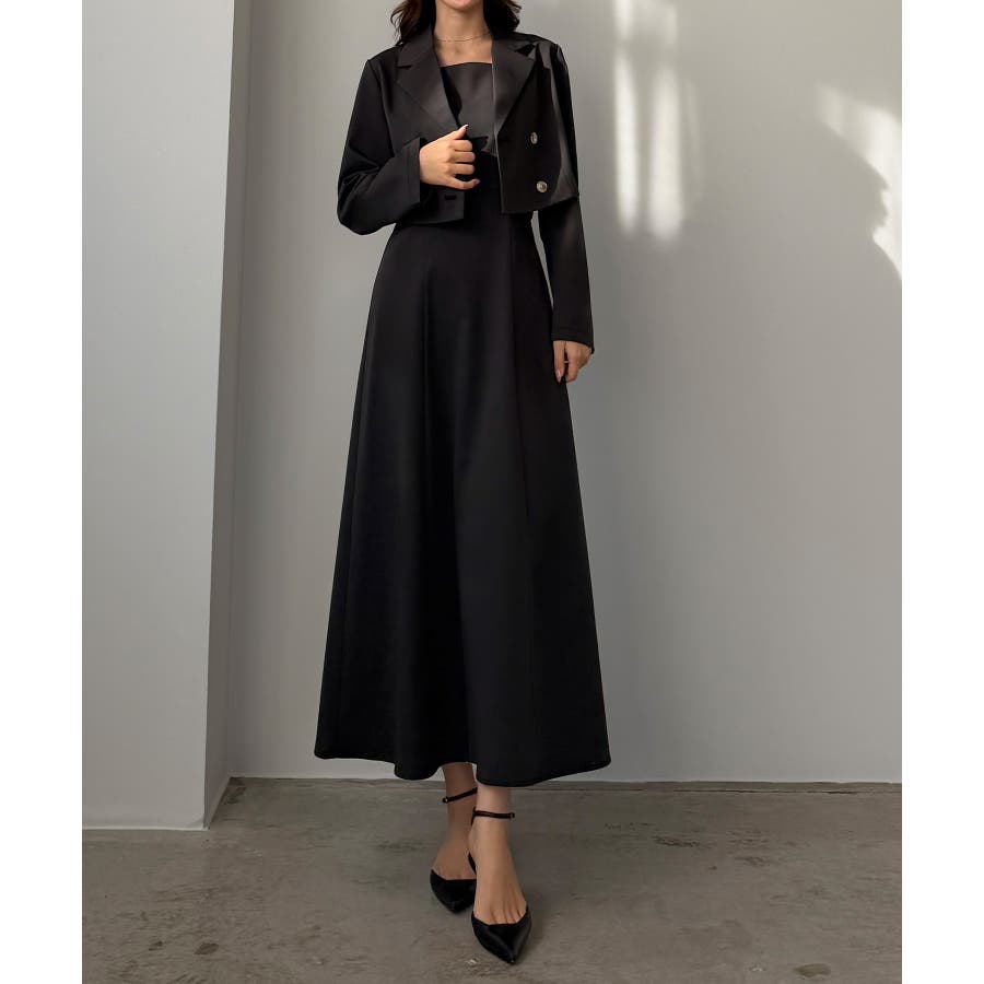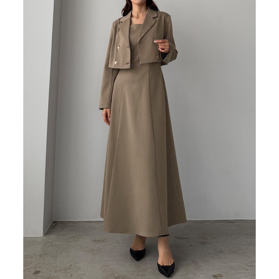 Louere バックスリットショートジャケットsetキャミフレアワンピース