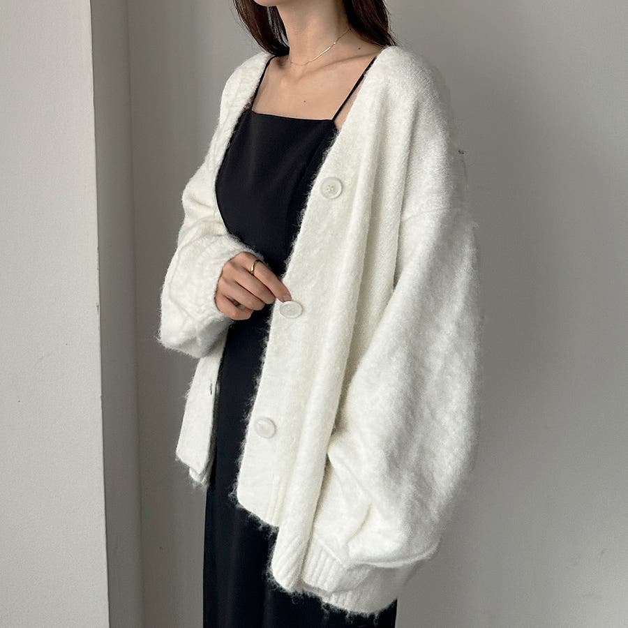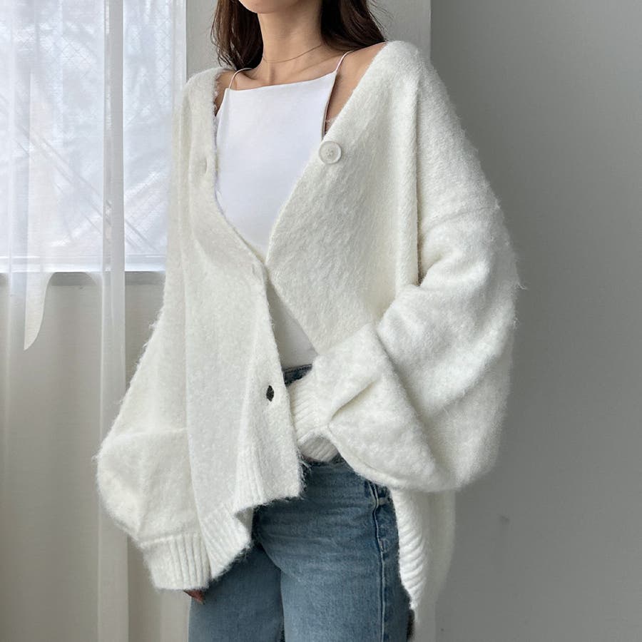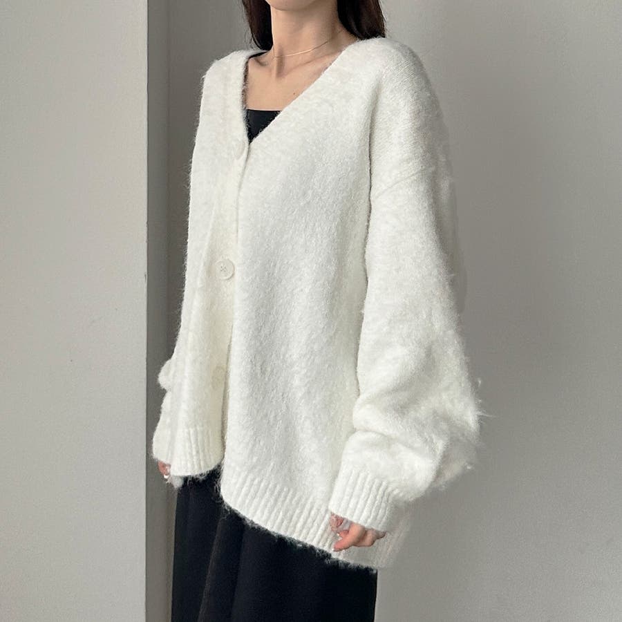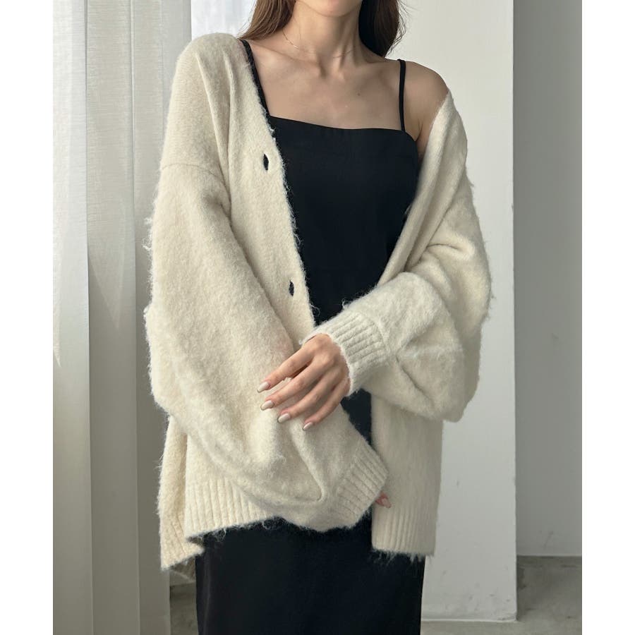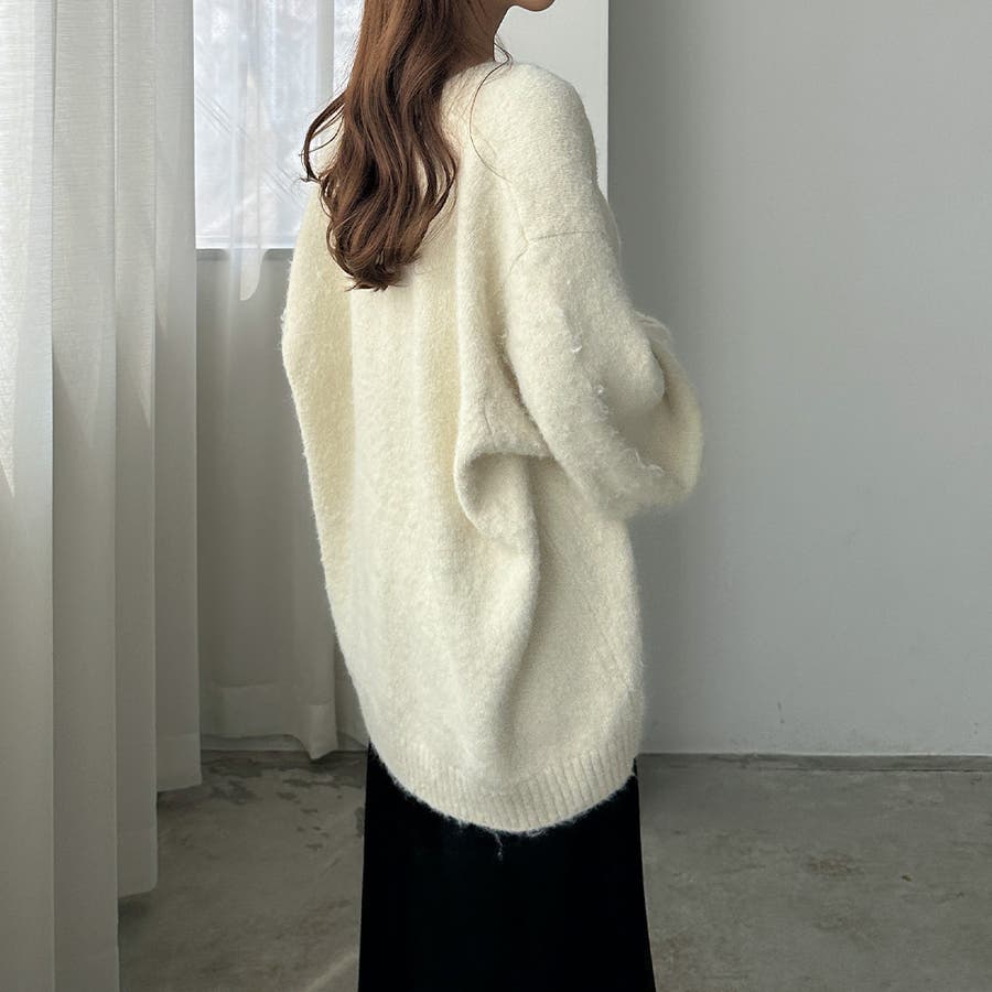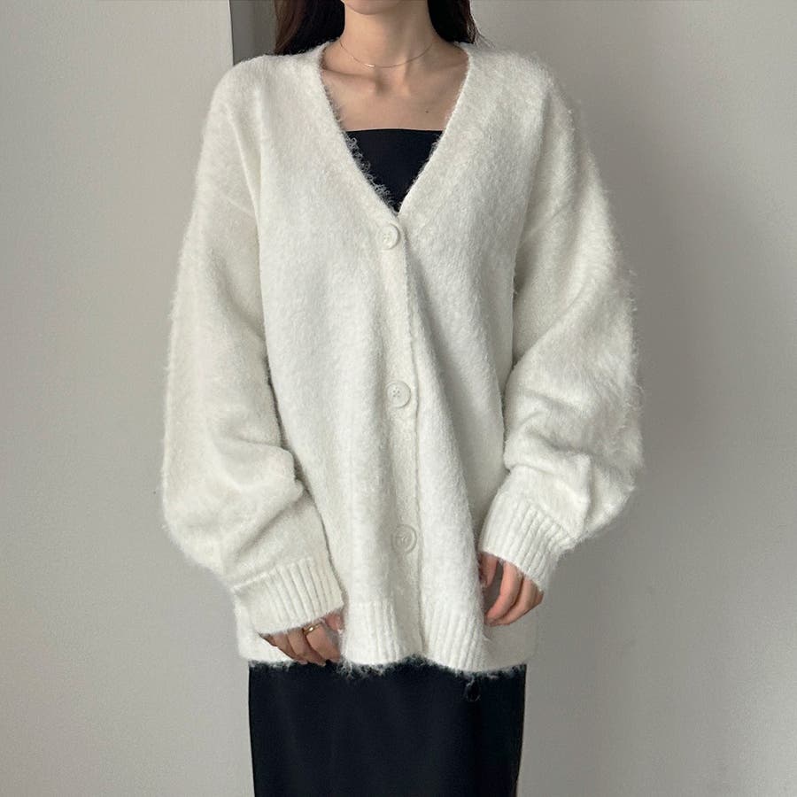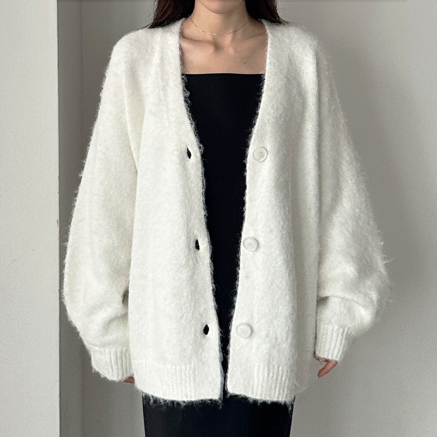 【オフホワイト】Louere ボリュームVネックシャギーニットカーディガン