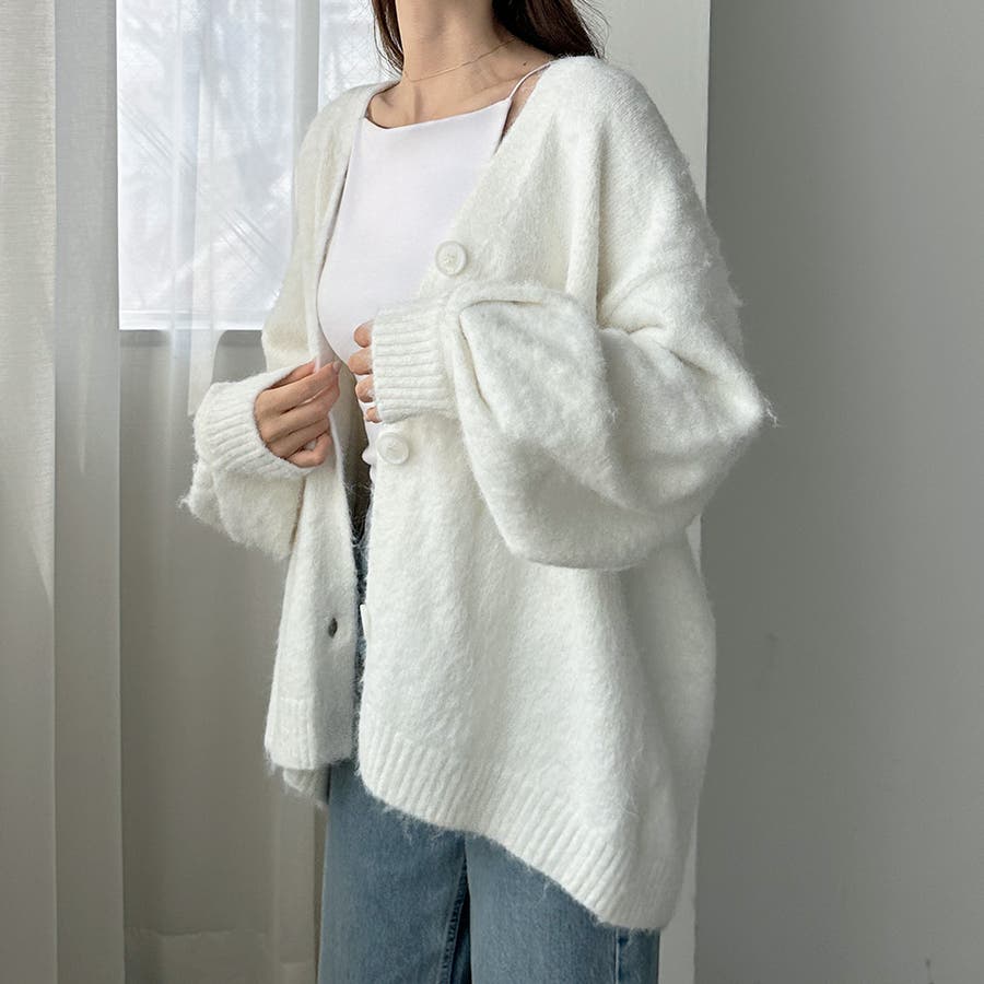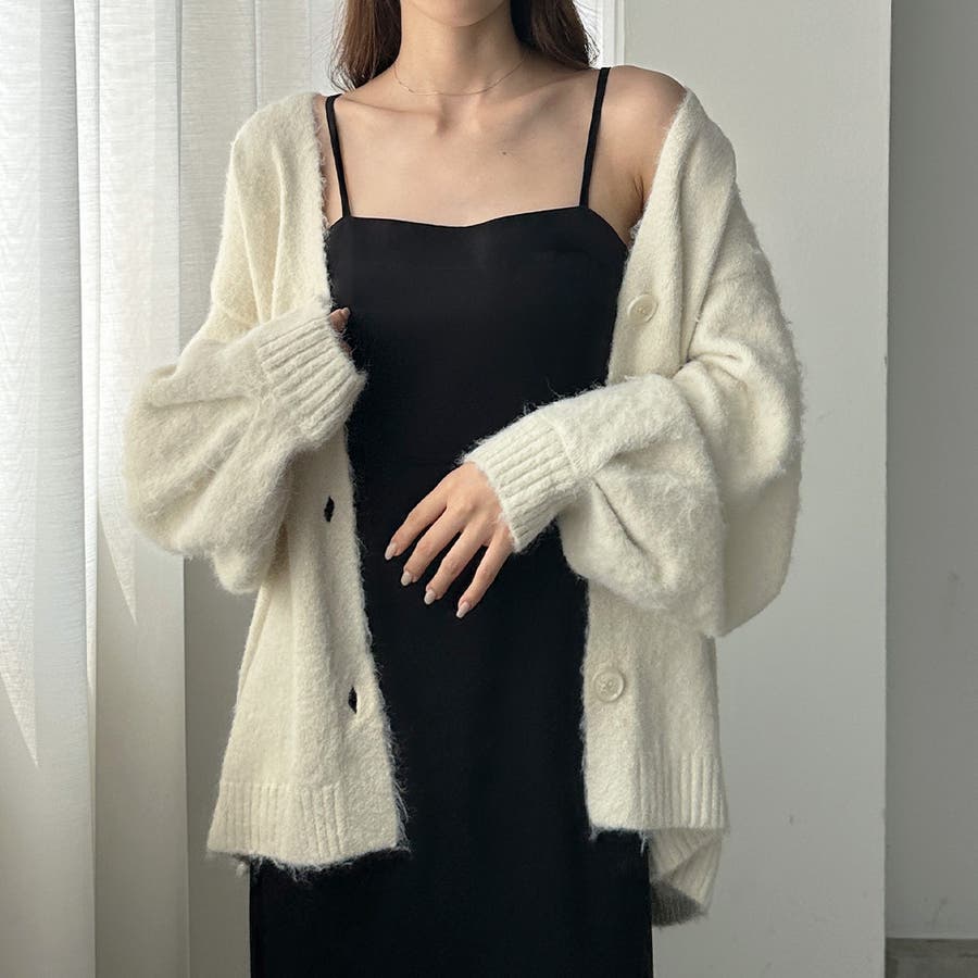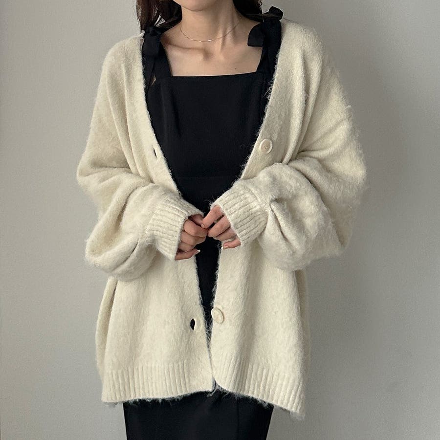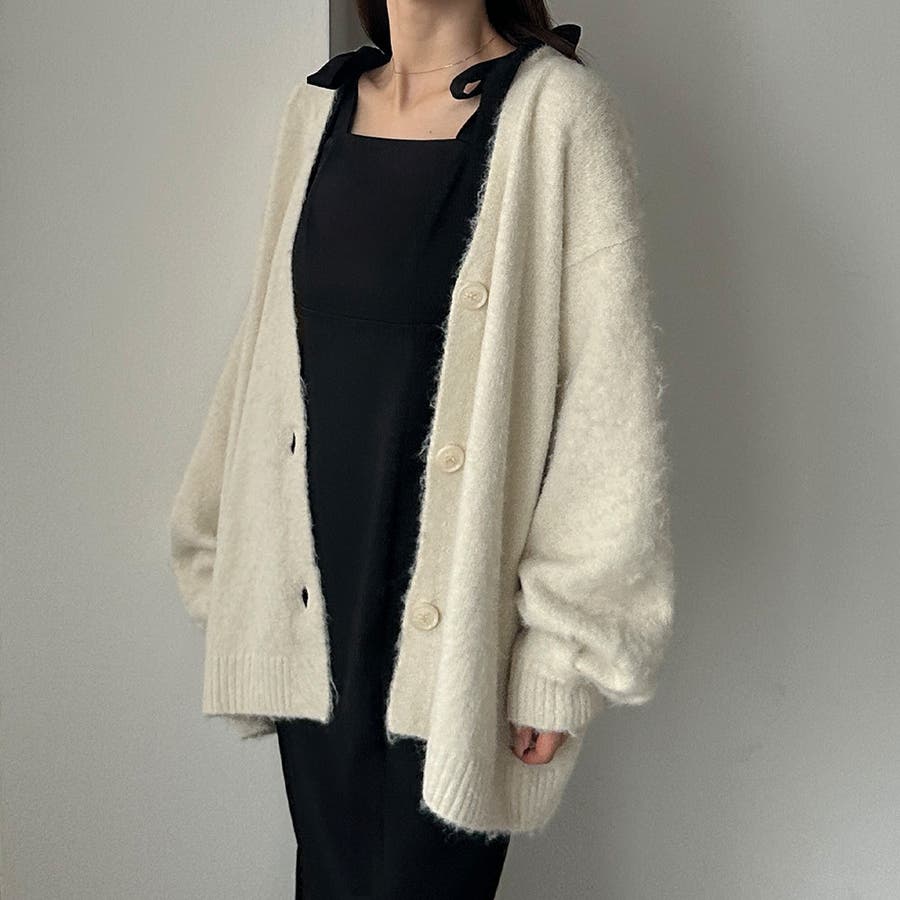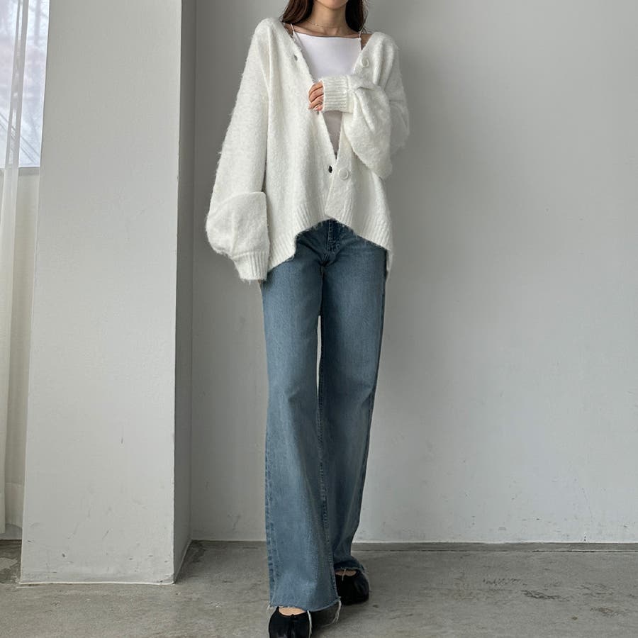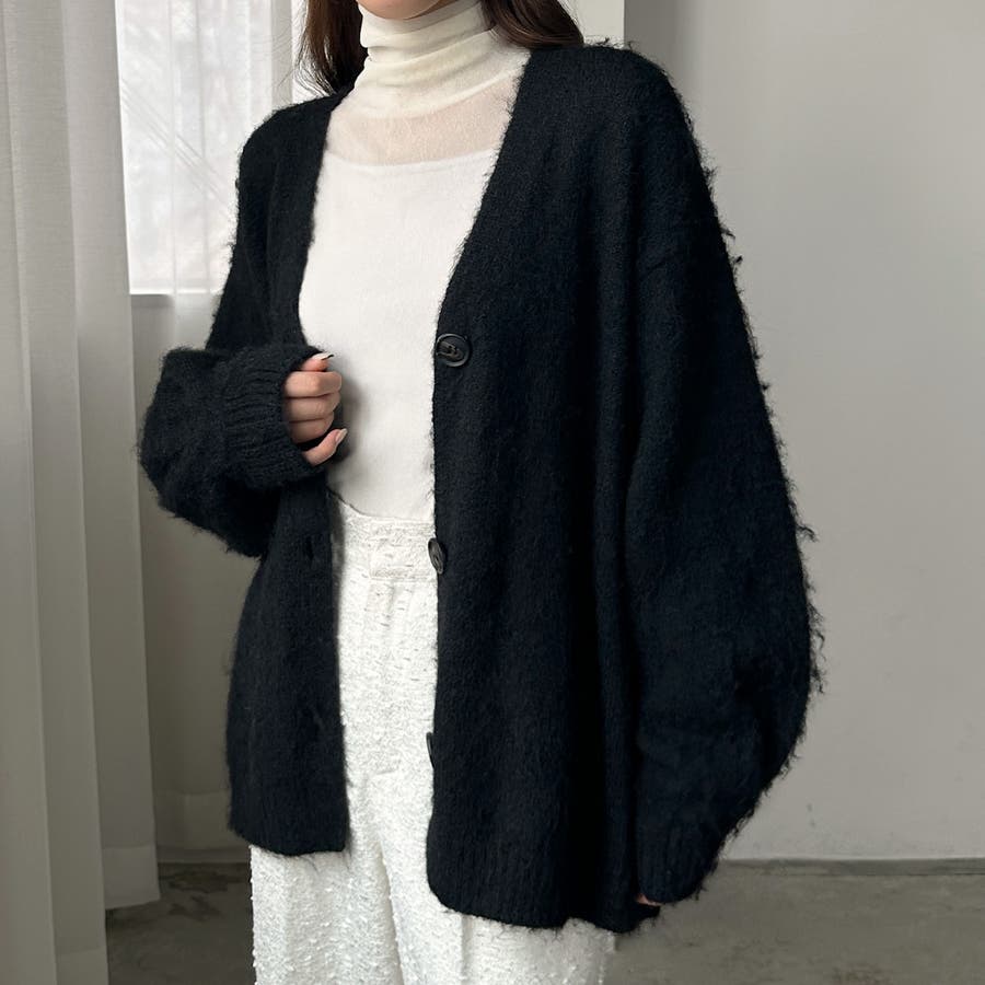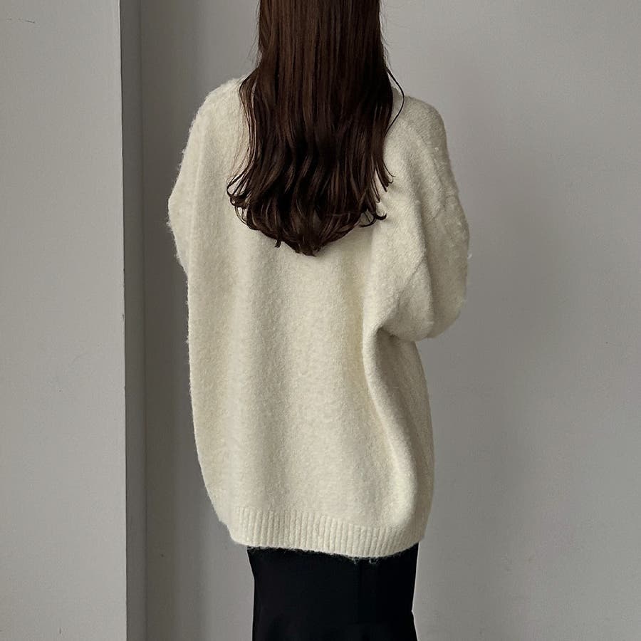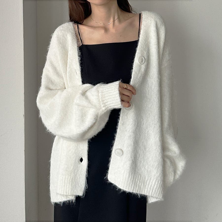 【オフホワイト】Louere ボリュームVネックシャギーニットカーディガン
