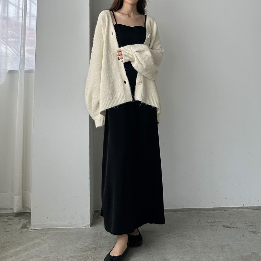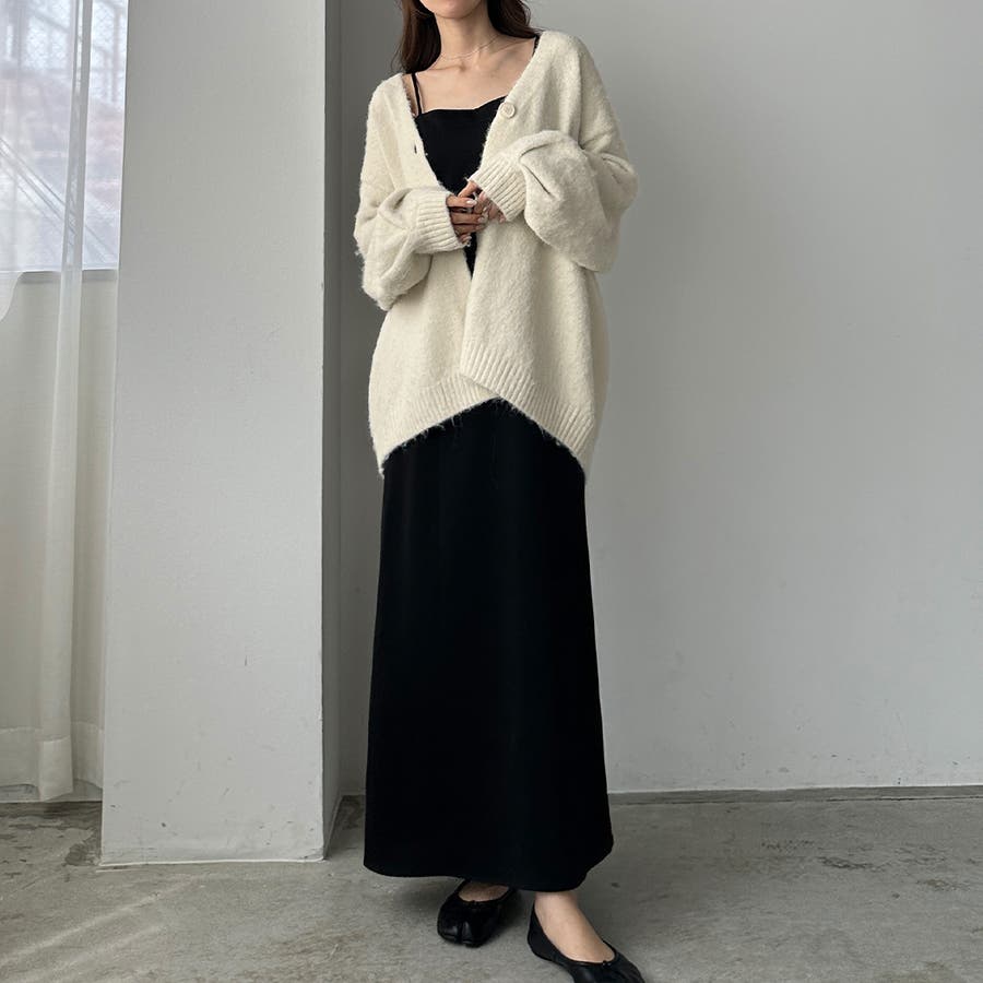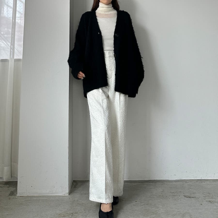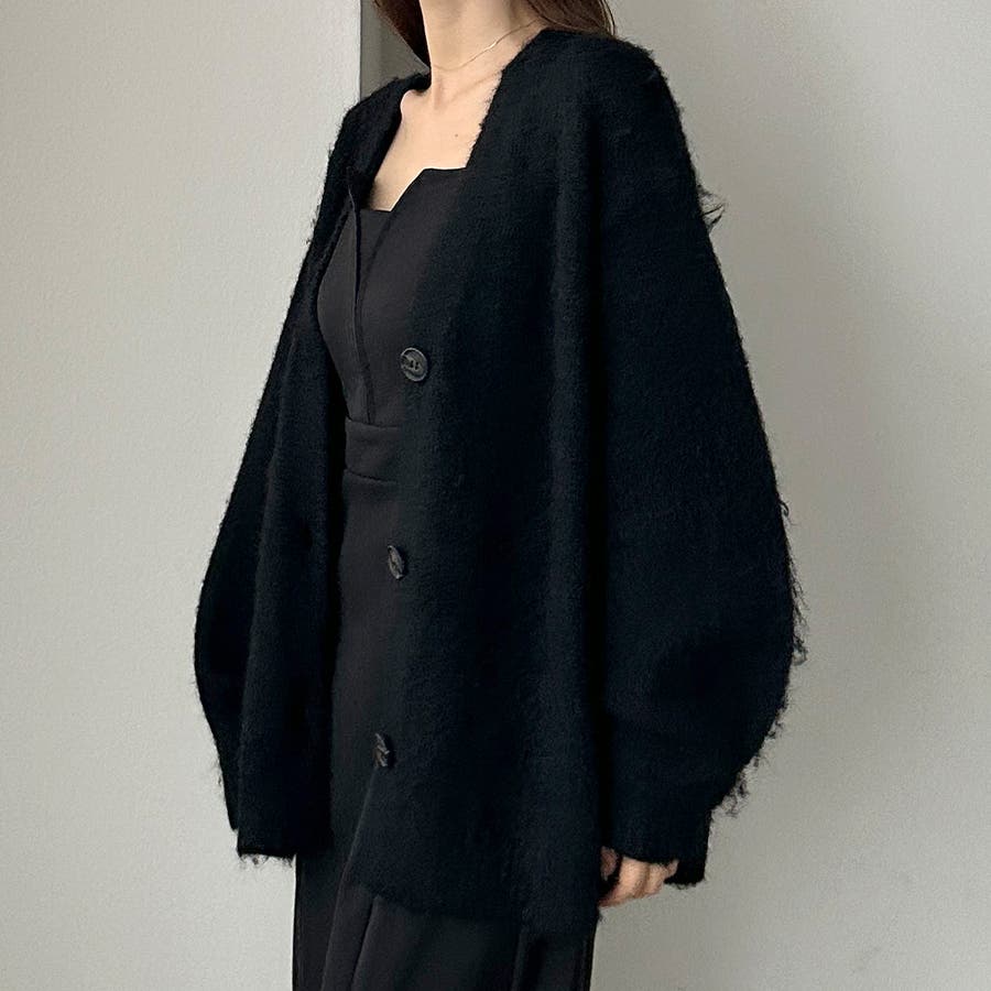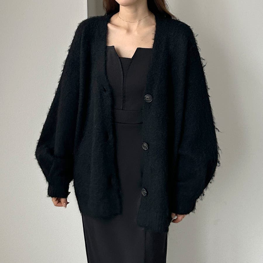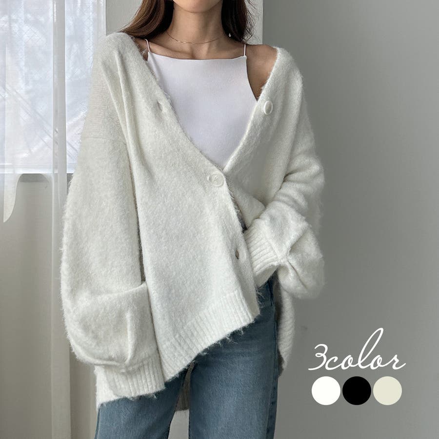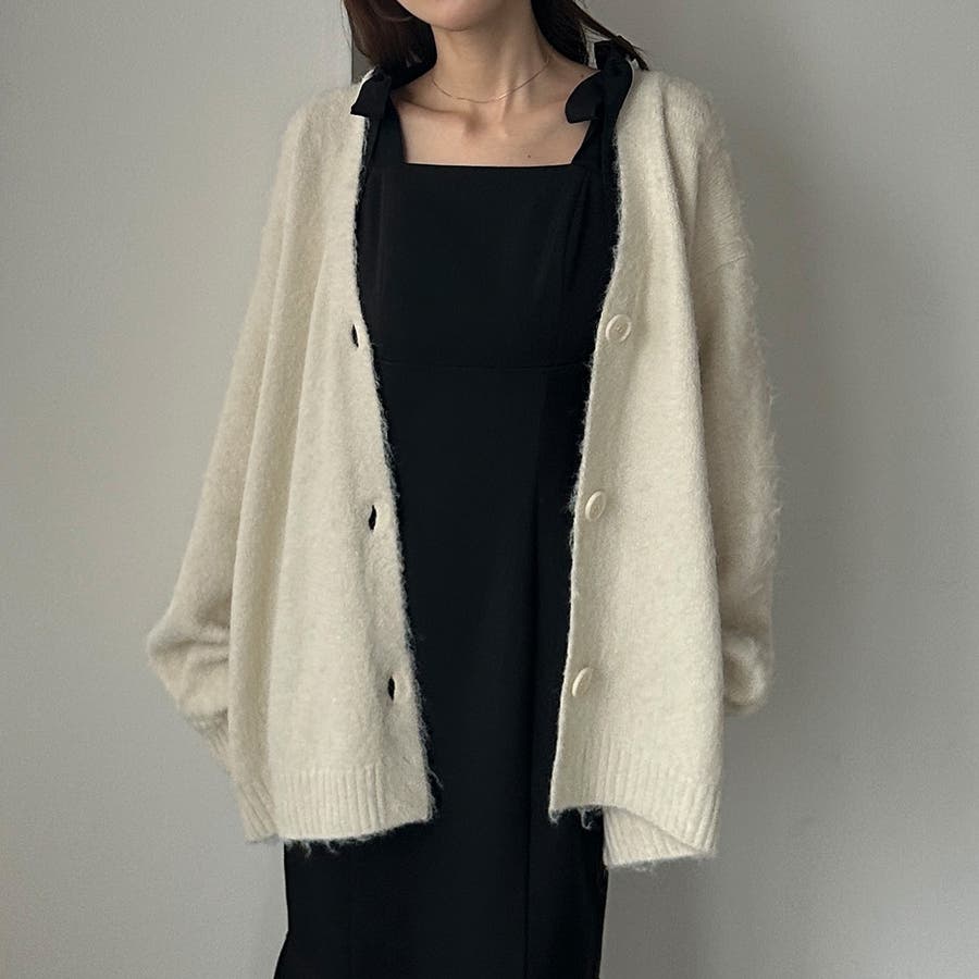 【オフホワイト】Louere ボリュームVネックシャギーニットカーディガン