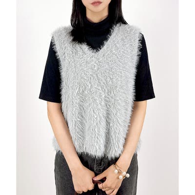 ふんわり毛足の長いシャギーニット素材に、パールモチーフをあしらった上品なニットベスト。