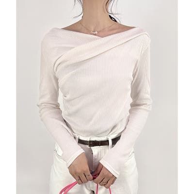 絶妙なアシンメトリーネックがデコルテを美しく見せてくれて、抜け感たっぷり◎