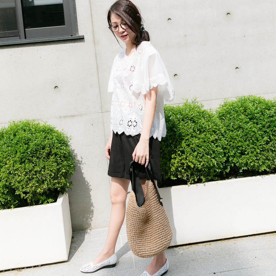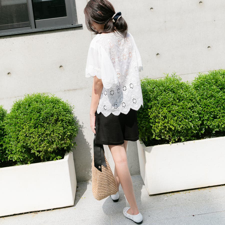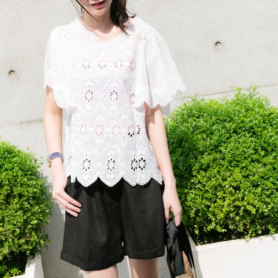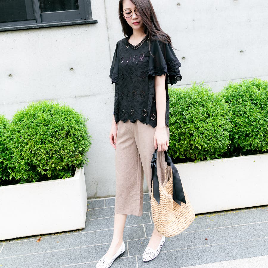 Vネック カットワークレース刺繍ふんわりスリーブトップス 春夏