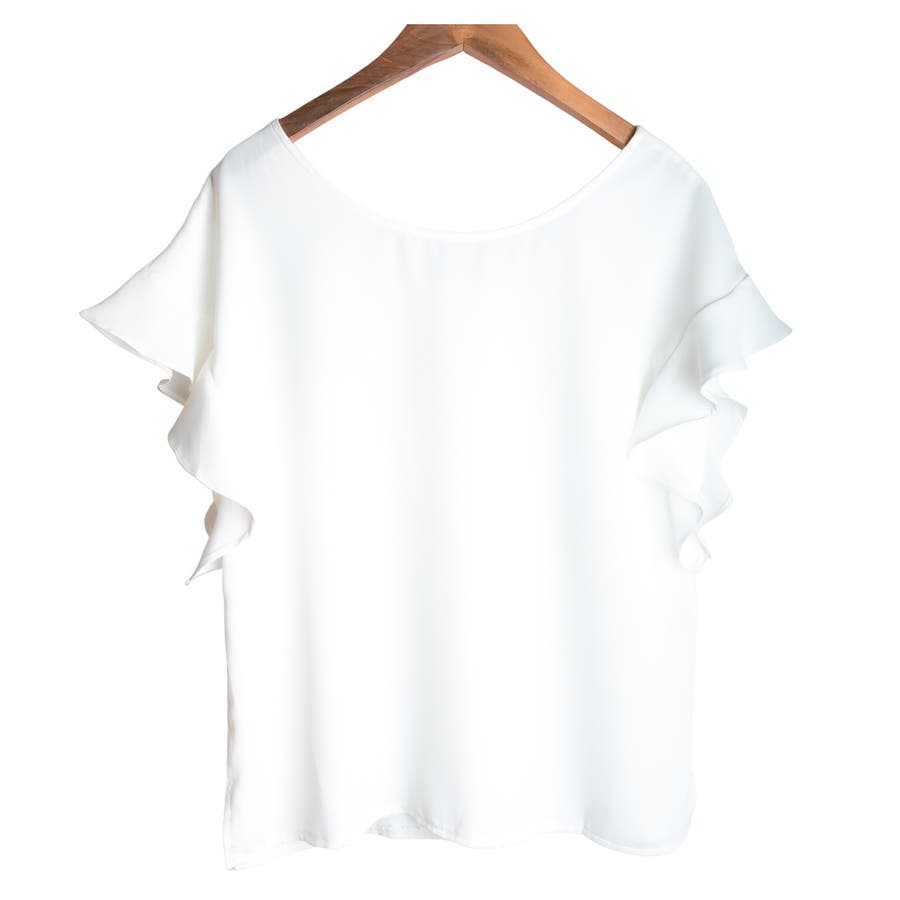 袖がフレアに広がる花ようなシルエットに両面着れるフリルがデザインした女性らしいブラウスです。