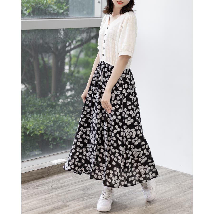 ふんわり揺れ広がるドラマティックなフレアシルエットが魅力のドッキングワンピース。