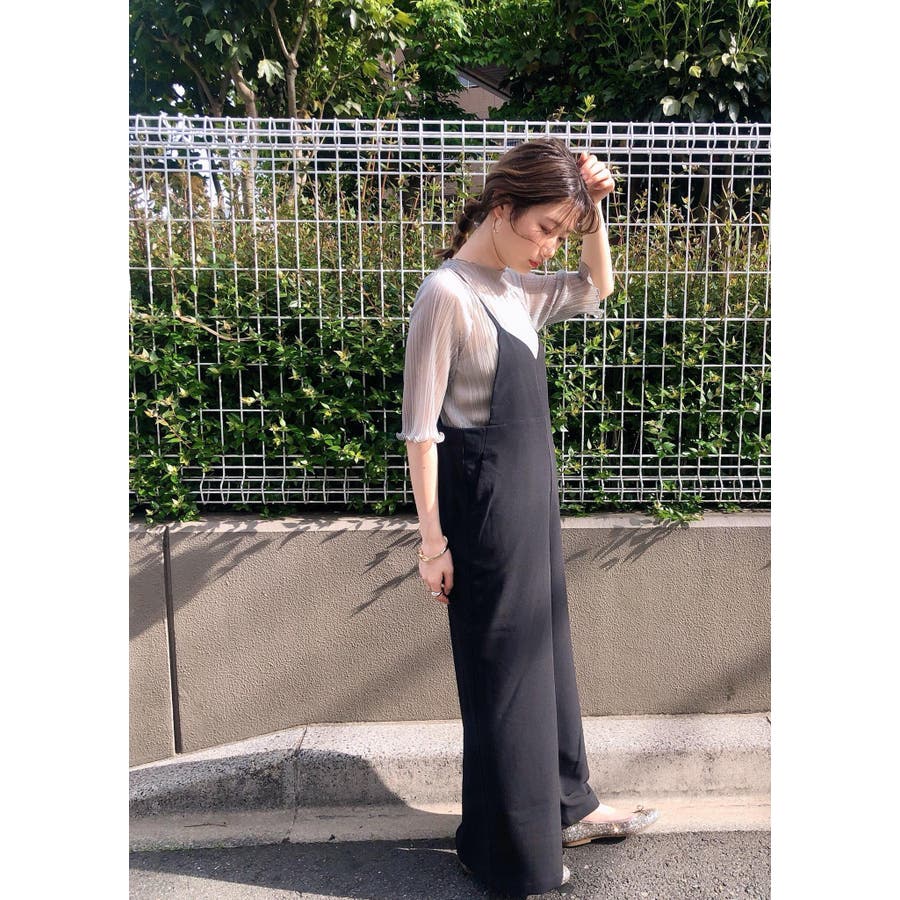 サロペットは、インナーを自在に変えられる便利アイテム。1枚持っていると、ロングシーズン使えるので重宝します。五分袖×透け感のあるトップスなら、ハイネックでも暑苦しく見えません。
