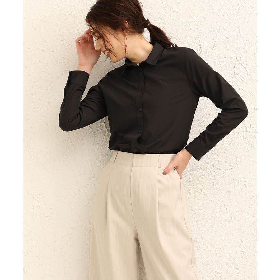 襟、カフスが付いたシンプルなワイシャツはマニッシュコーデの定番トップス。男性のようにネクタイはしめませんが、パンツにインして、きちんと感あるコーデを目指して。細めなシルエットのワイシャツは上半身をコンパクトに見せてくれるので、パンツやタイトスカートなどボトムスを選ばず着ることができます。