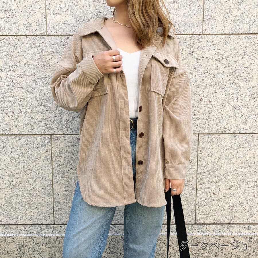 トレンドのビッグシルエットのシャツは、コーデュロイ素材でカジュアルに仕上げるのがおしゃれ上級者。デコルテがきれいに見えるインナーを合わせることで、カジュアル過ぎない女性らしいコーデになりますよ。