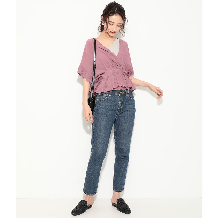 雨の日のデートで歩き回る予定があるときは、ショート丈トップス×デニムパンツで動きやすく。くすみピンクのカシュクールブラウスで、パンツスタイルでも女性らしいファッションに仕上がっています。足元は、スニーカーよりもパンプスがおすすめです。
