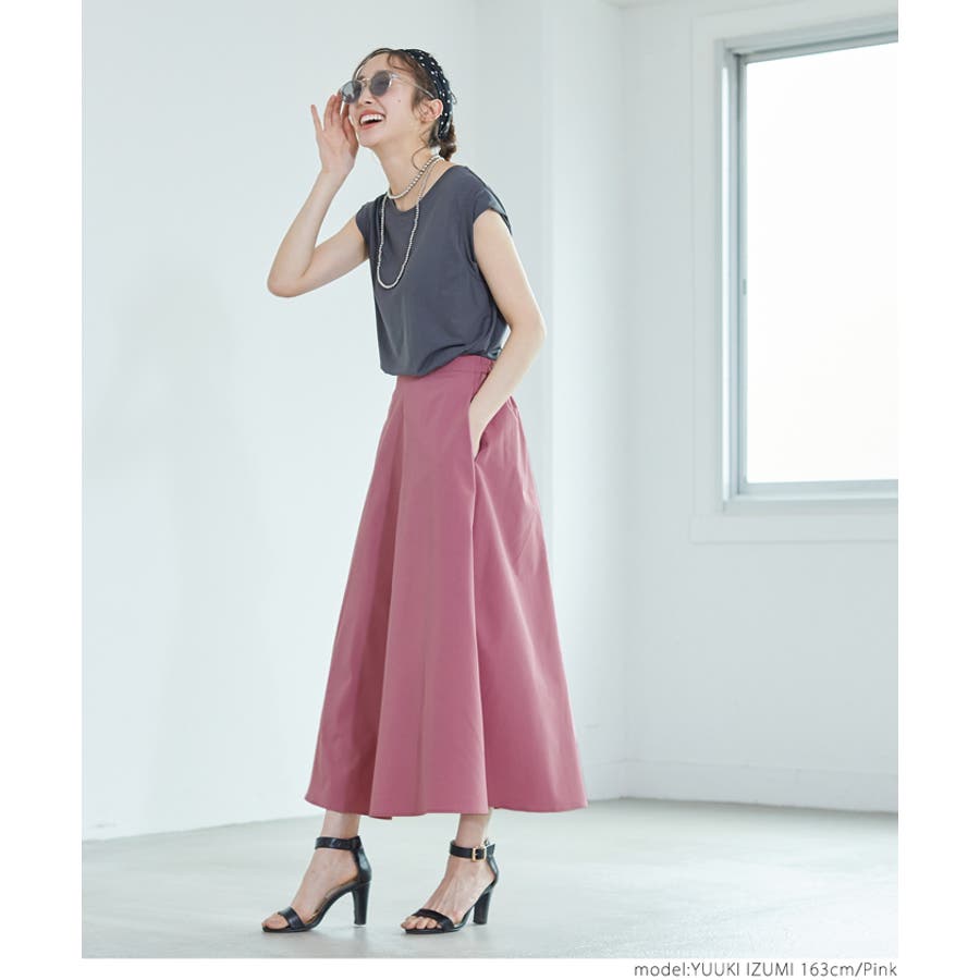 ロングスカートは今年のトレンドでもあるので、シンプルコーデにもぜひ取り入れたいところ。ポリエステルや綿素材を選べば、1年中着回せます。