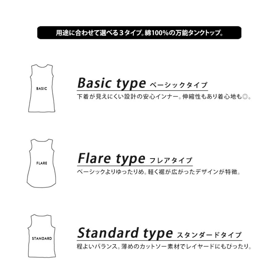 ベーシックタイプは細部にこだわったうれしいバランス設計。脇周りにしっかりフィットしとにかく下着が見えにくいのが特徴のタンクトップです。1枚でもインナーにも快適に着まわせます。窮屈だった脇下のラインを少しだけ楽になるよう改良しました。しっかりとした伸縮性で程よく身体にフィットする着心地の良さは自信をもっておすすめします。すっきりとバランスのいい胸周りは、程よく密着してかがんだ際の下着の露出を抑えます。丈も短すぎず、長すぎずのセミロング丈。お尻のあたりまで届く使いやすいサイズになっています。