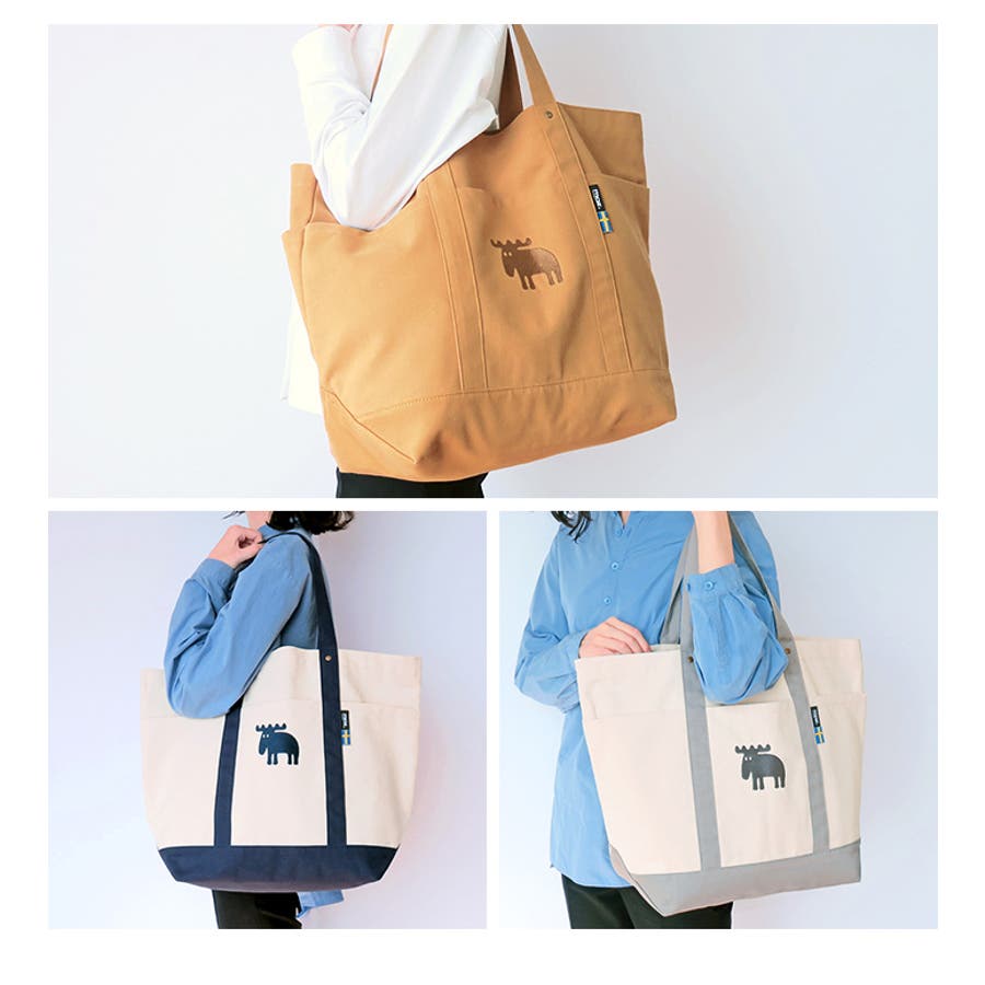 北欧ブランドmoz・SCANDINAVIAN FORESTのエルク・ハリネズミがデザインされた帆布素材のトートバッグ。マチが広く、厚手で丈夫なのでお買い物やちょっとした小旅行にぴったり。ポケットは外に6つ、内に3つあり、小物の整理がしやすくなっています。生地と同色系の糸で刺繍がアクセント。moz裏面にはスウェーデン語で「あなたのためにぼくはここにいるよ」 という意味の文字刺繍が。