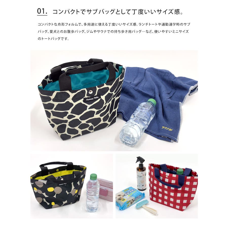 コンパクトな舟形フォルムで、多用途に使える丁度いいサイズ感。ランチトートや通勤通学時のサブバッグ、愛犬とのお散歩バッグ、ジムやサウナでの持ち歩き用バッグ…など、使いやすいミニサイズのトートバッグです。持ち運びが苦にならない軽量のポリエステル素材。撥水加工生地を使用しているので、水を弾き、汚れも拭き取りやすくなっています。マチ幅11cmで小さいながらもしっかり自立。