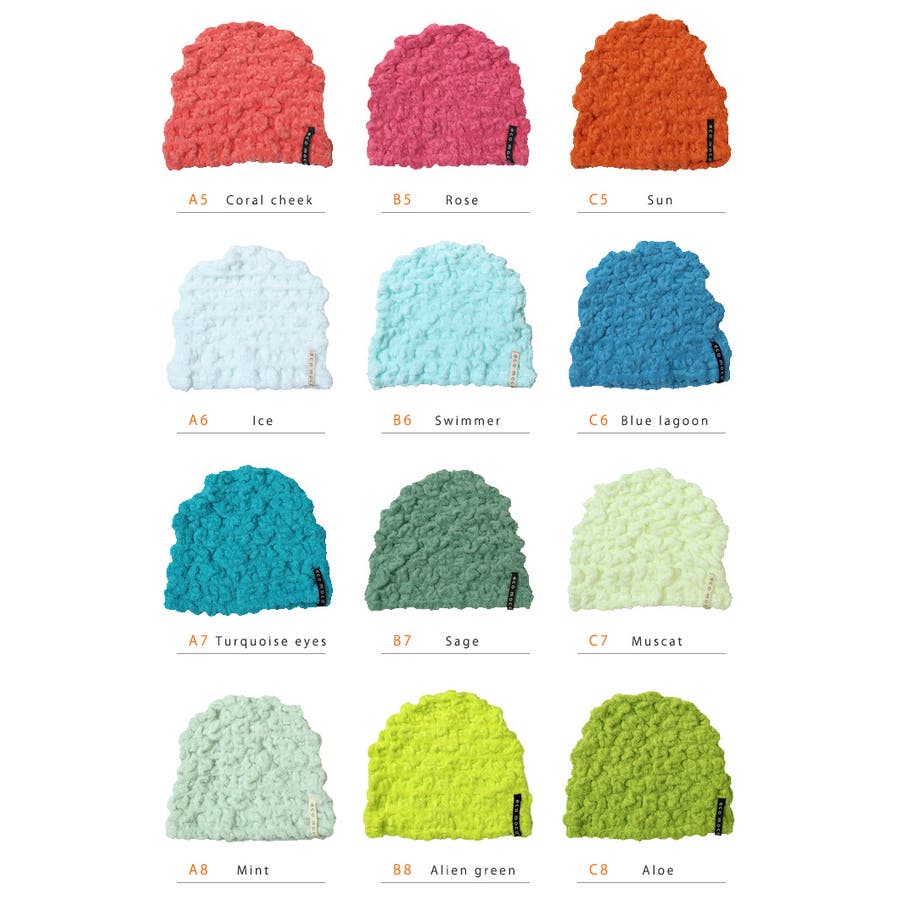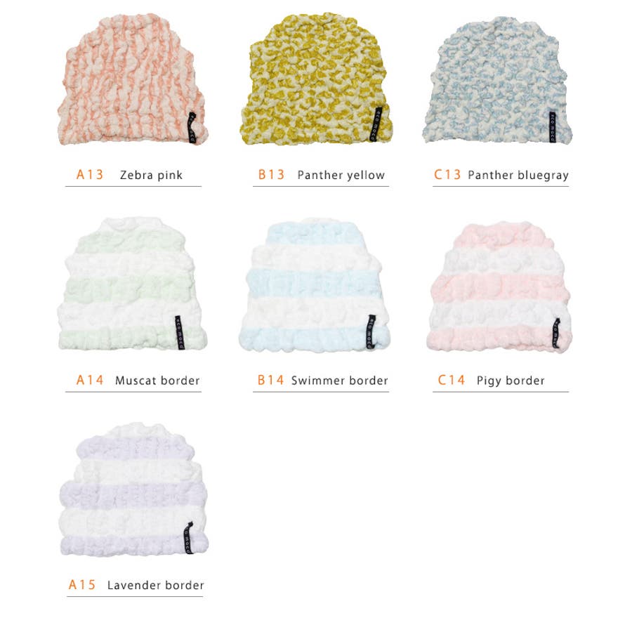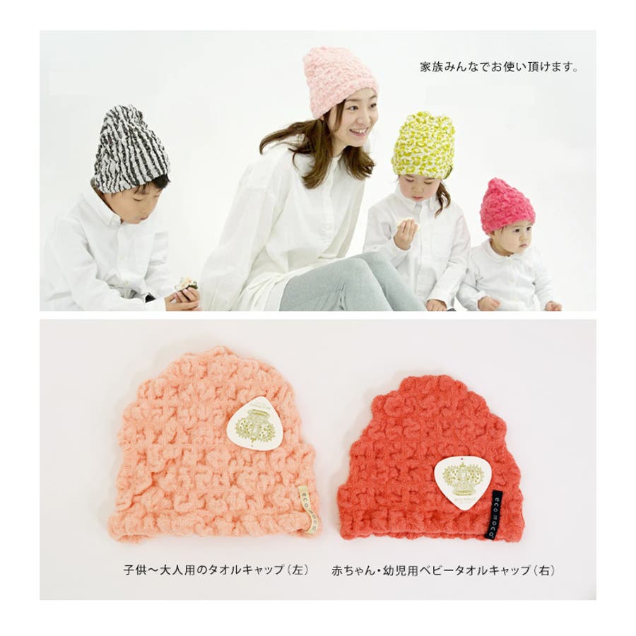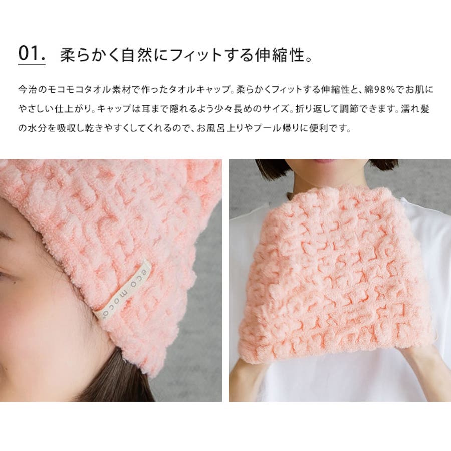 今治のモコモコタオル素材で作ったタオルキャップ。柔らかくフィットする伸縮性と、綿98%でお肌にやさしい仕上がり。キャップは耳まで隠れるよう少々長めのサイズ。折り返して調節できます。濡れ髪の水分を吸収し乾きやすくしてくれるので、お風呂上りやプール帰りに便利です。クラボウとの共同開発によるオリジナルの糸無撚糸ピアノラを使用。ソフトでナチュラルな肌ざわりで、吸水性や速乾性などの使用感も追求した素材です。モコモコシリーズは、タテ糸とヨコ糸に伸縮糸を織り込み、熱処理し収縮させる事によりモコモコとした形状が出来上がります。表情や風合いがとても楽しい、愛媛県今治市の森商事株式会社が開発したオリジナル商品。実用新案登録【第3086950号】太陽光発電の電力で織り上げているので、CO2削減に貢献しています。
