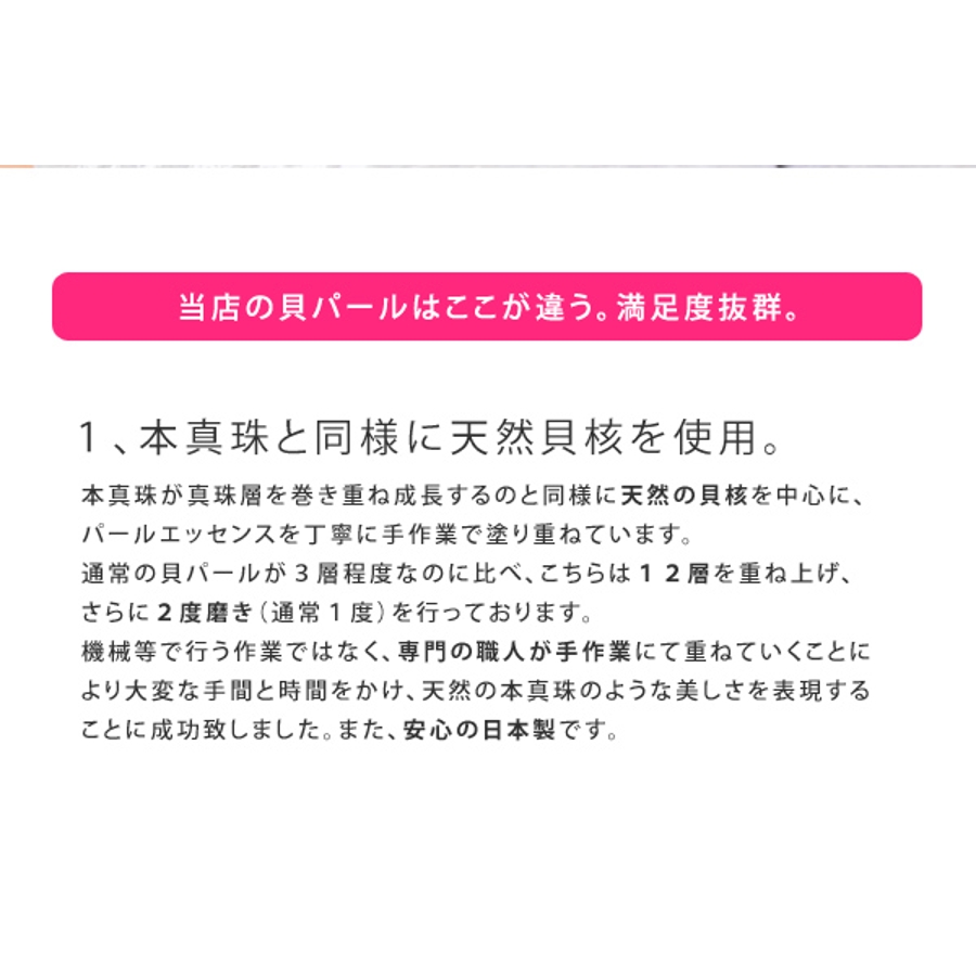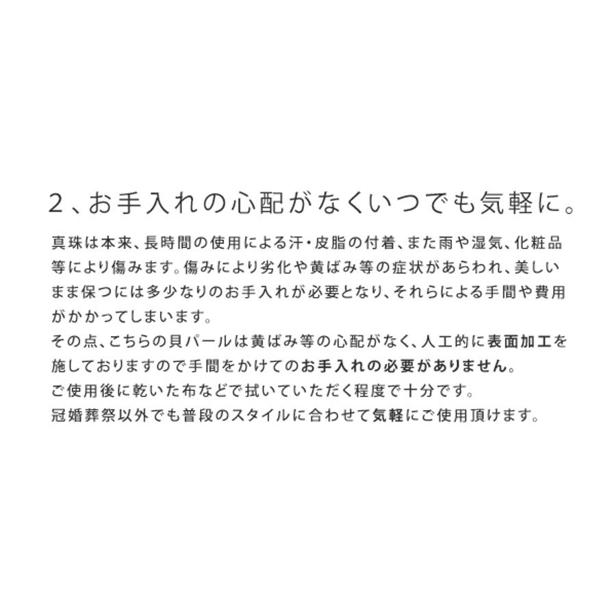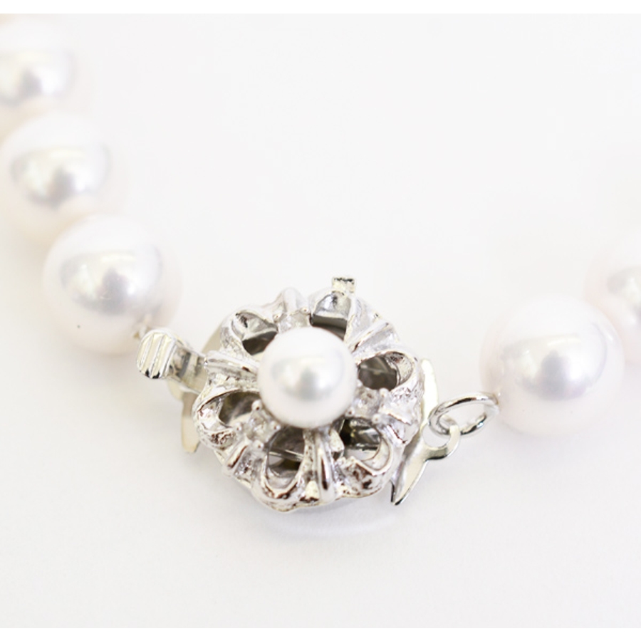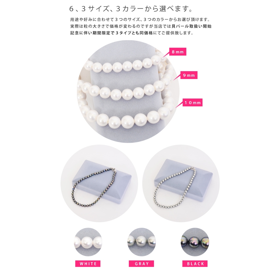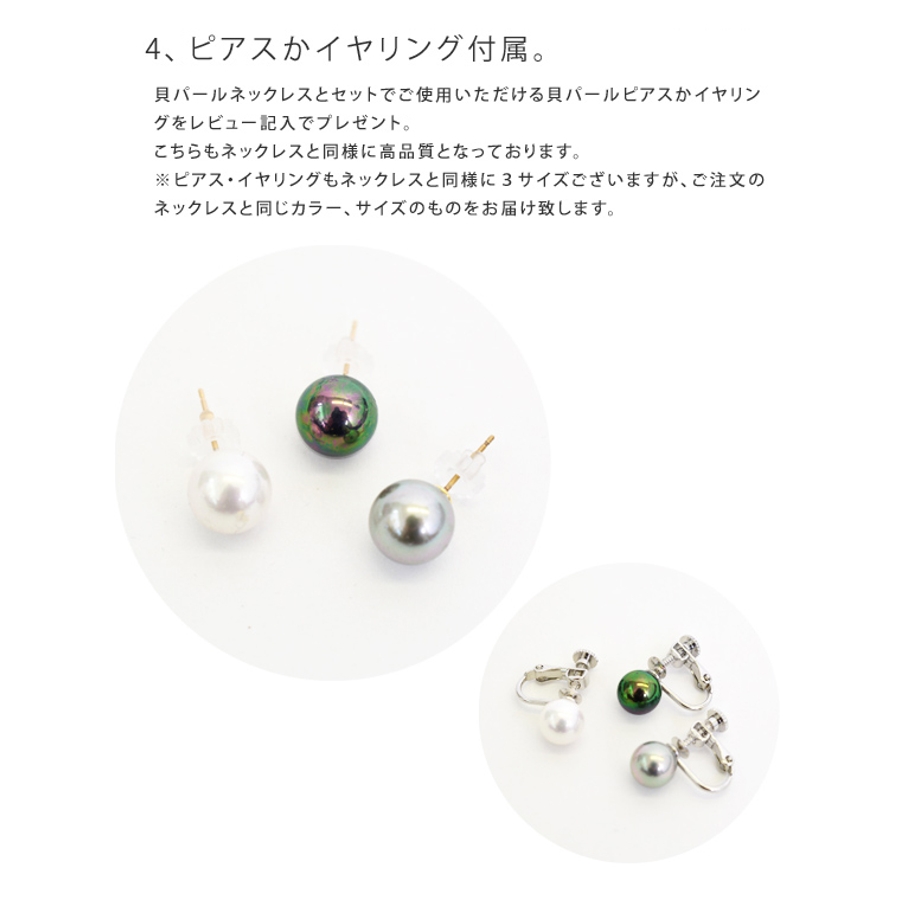 上品な艶で美しい輝きを放つ貝パールネックレス。天然貝核を使用したこだわり抜いた本製品。フォーマルだけでなくシャツやカットソーなどに合わせてもキレイに収まるので普段使いにも。1つ持っているだけで様々なシーンに活用できる、高級感や美しさを引き出す万能すぎる定番アイテムです。自信をもっておすすめします。