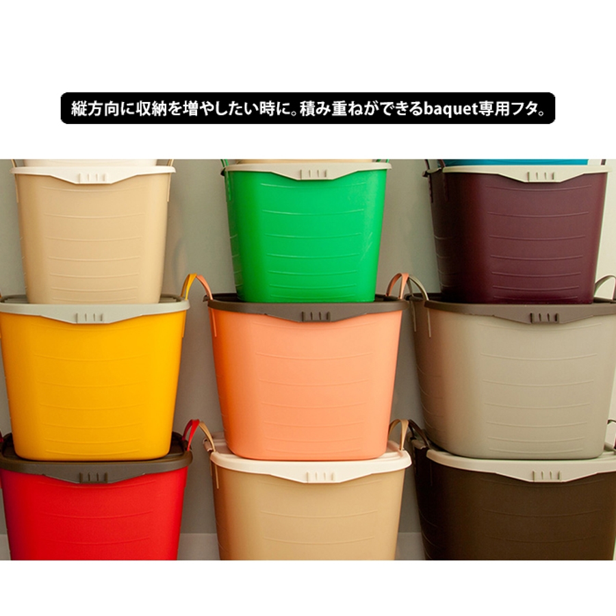 バケット専用のフタ「onbaquet -オンバケット-」。こちらを利用することにより積み上げたり、中身をホコリから守ったりとさらに機能性アップ。ネームタグを差し込むスペースもついているので管理もしやすくなります。バケットにあわせて同色系にしたり、別のカラーで雰囲気を変えてみたりさらにおしゃれな収納バスケットになります。baquetに放り込んで、onbaquetを載せるだけ。出し入れラクラクのポンポン収納は、ズボラさんのお部屋でも簡単に片付きます。