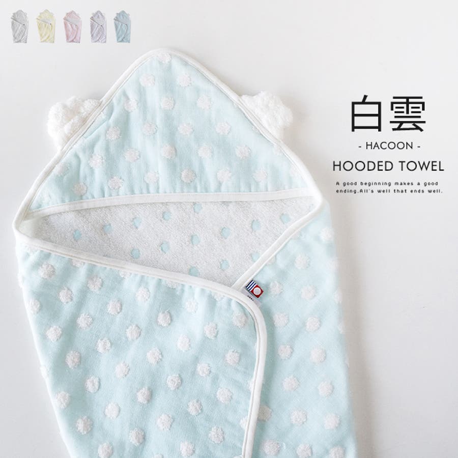 ベビーの小さな頭すっぽりとやさしく包むフード付きおくるみ。フード部分にはモコモコのくま耳付き。ふわふわと優しい肌触りが心地いい綿100%のタオル生地は、タオルの生産地として有名な今治で作られた『今治タオル』。綿花が本来持つ柔らかさや吸水性を引き出し、究極の肌触りを追求しています。タオル地なのでベビー用のバスタオルやタオルケットとしても活躍します。