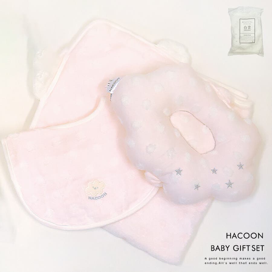 雲のようにふっくらと柔らかで、心地よくなめらかな肌触りの今治タオル「白雲」タオルのベビー用ギフトセット。日常的にお使い頂ける、おくるみ、スタイ、授乳枕の3点セットです。