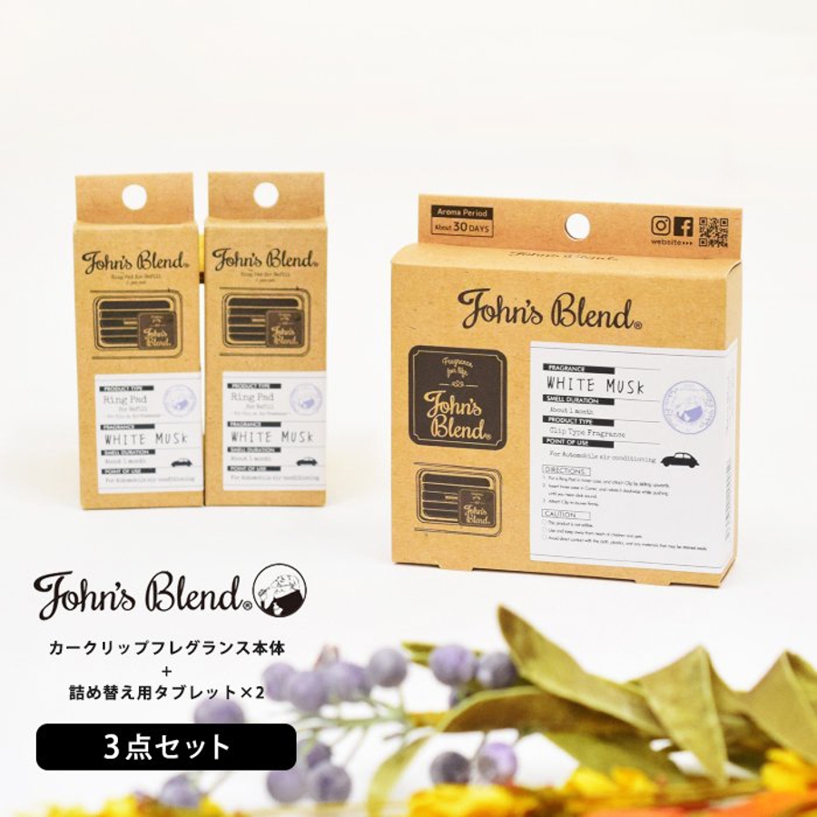 ジョンズブレンドのクリップオンフレグランスの本体と専用詰め替えタブレット2箱の計3点セット。詰め替え用タブレットの香りは本体と同じものをご用意。車のエアコンにクリップするだけで、凝縮された新鮮な香りが車内に広がります。コンパクトなので邪魔にならず、オシャレな見た目と香りがドライブを楽しくしてくれます。詰め替え用タブレットを買い足すのが面倒な方や、長期間継続して使いたい方にオススメです。
