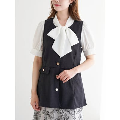 リボン結びをしたボウタイブラウスの上に重ねてリボンをアクセントにするとこなれた印象に仕上がるのでおすすめです。