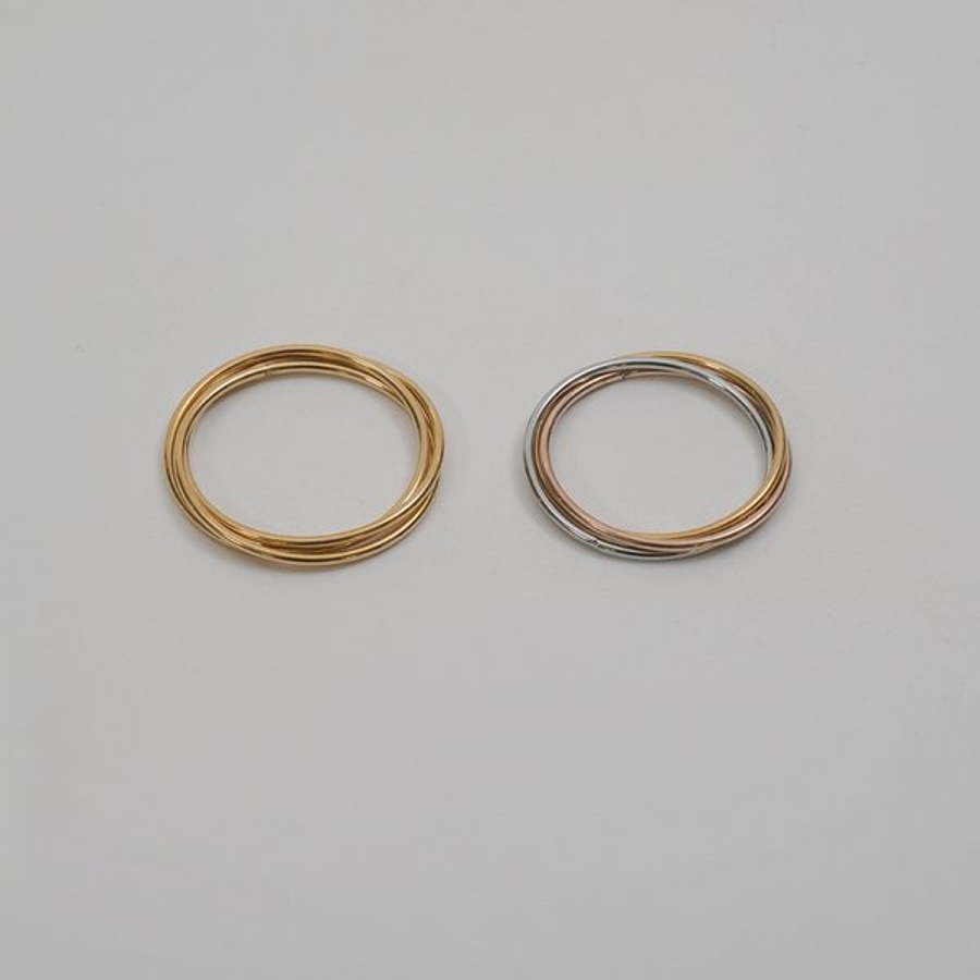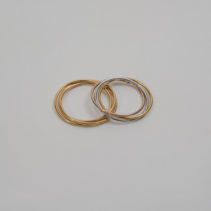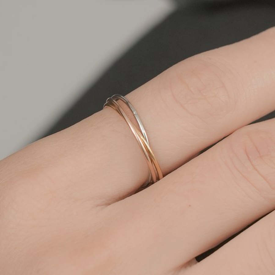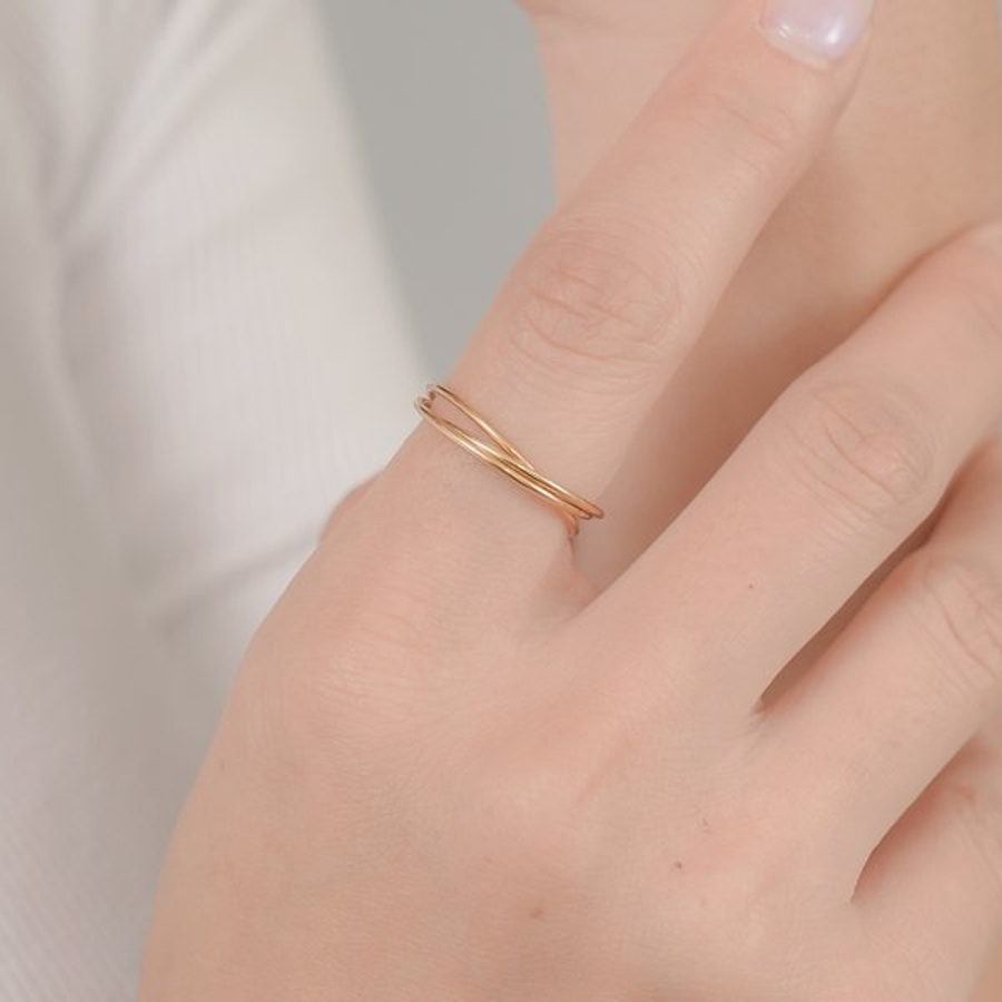 幅わずか1mmのスリムなリングが絡み合う3連リング。