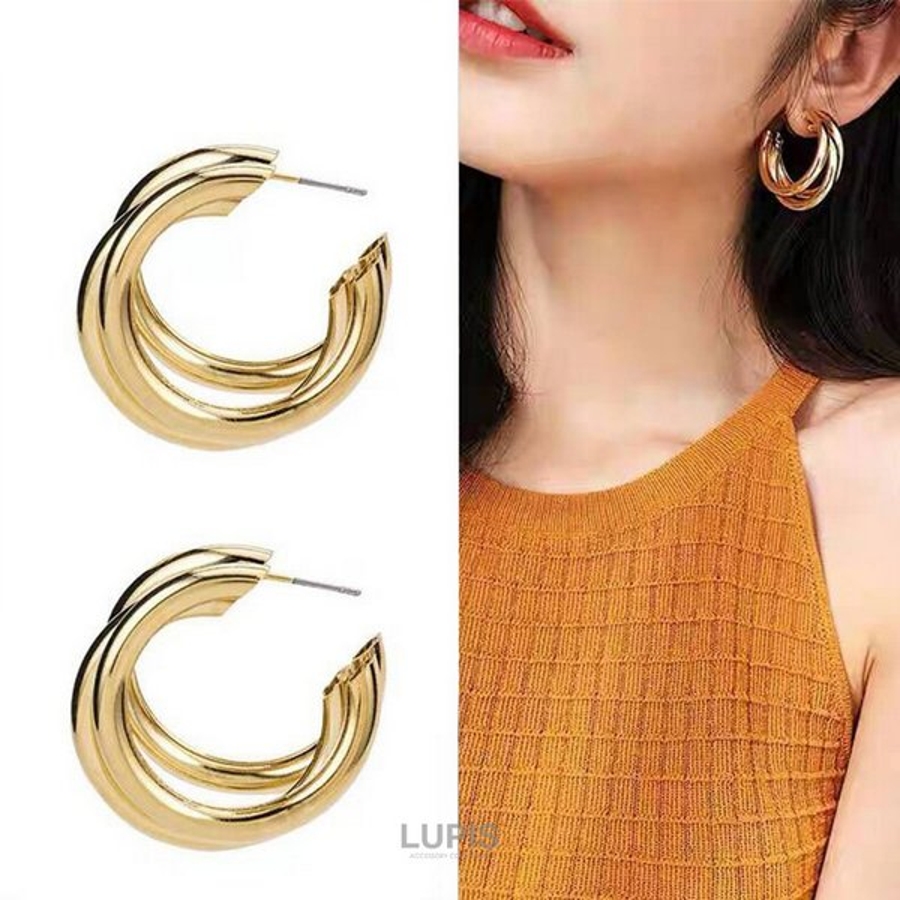 ワイドタイプのフープを3連重ねた、存在感のあるフープピアス。
