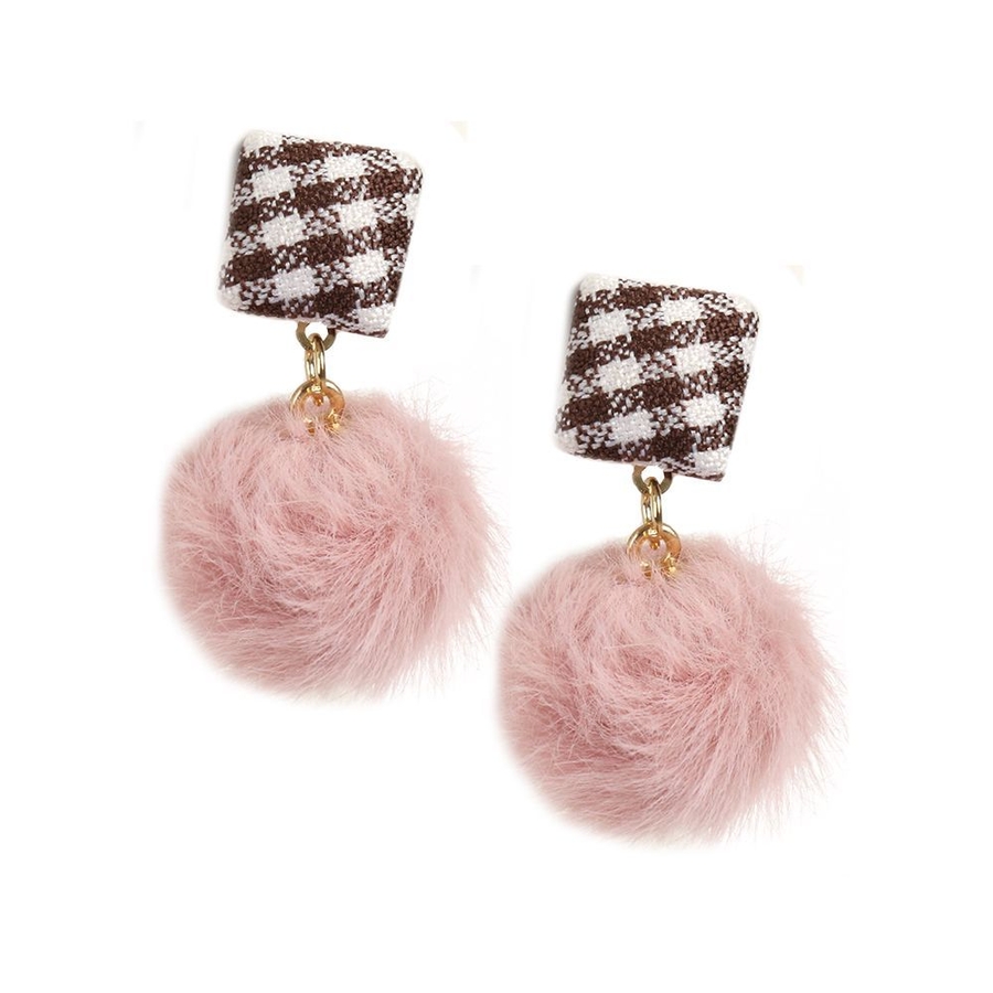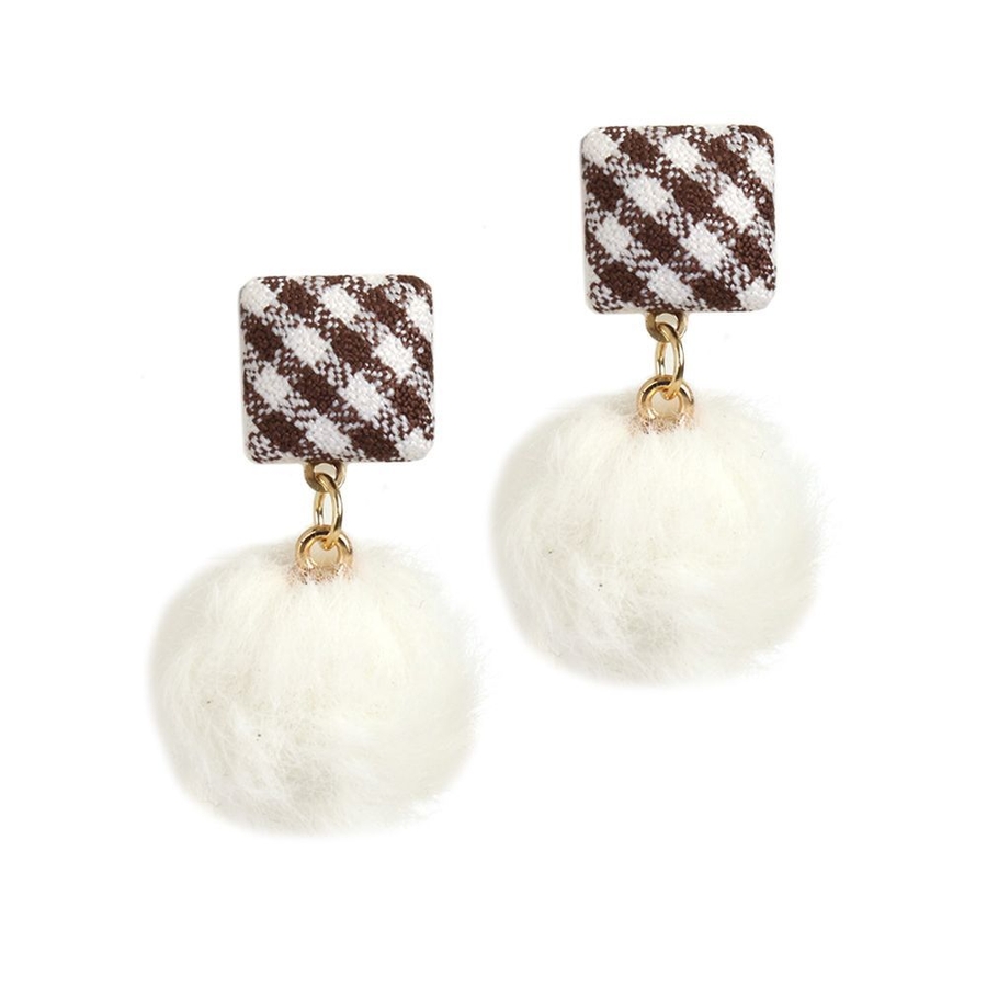 コロンとしたチェック柄のスクエアボタンとポンポンファーを組み合わせたピアス。