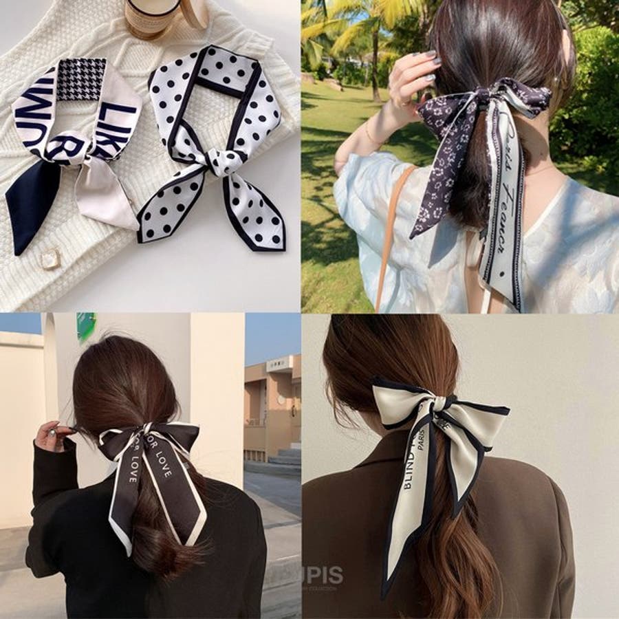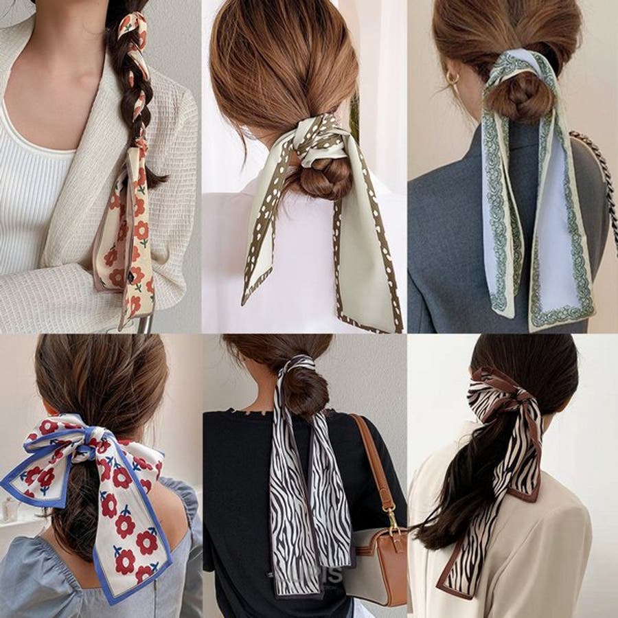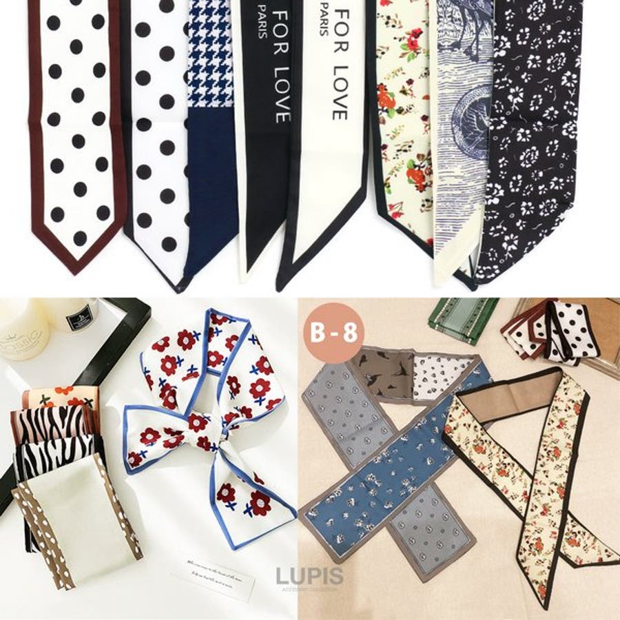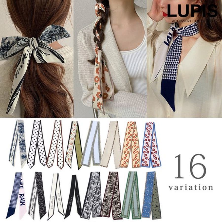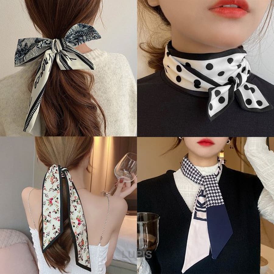 頭、首元、手首、腰、バッグ等、色んな用途で使える細長タイプのスカーフ。