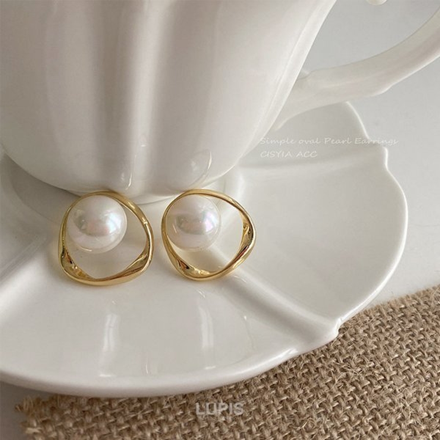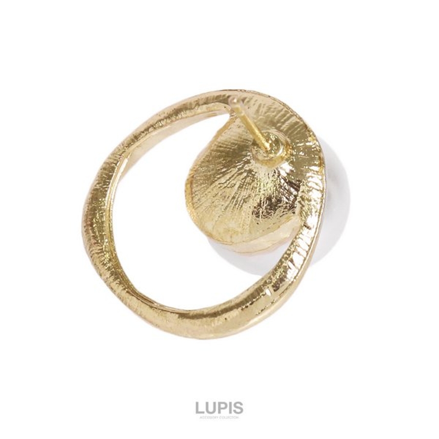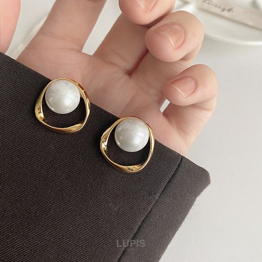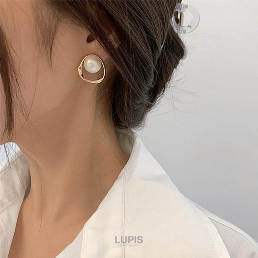 大粒パール×変形サークルフレームのエレガントなピアス。