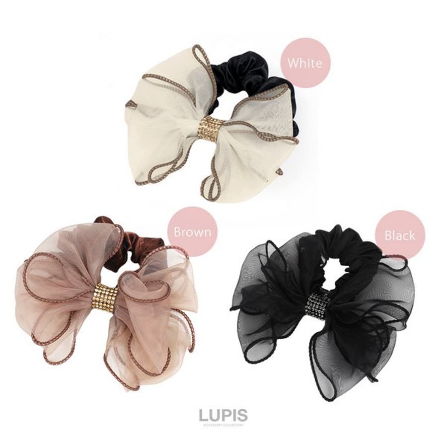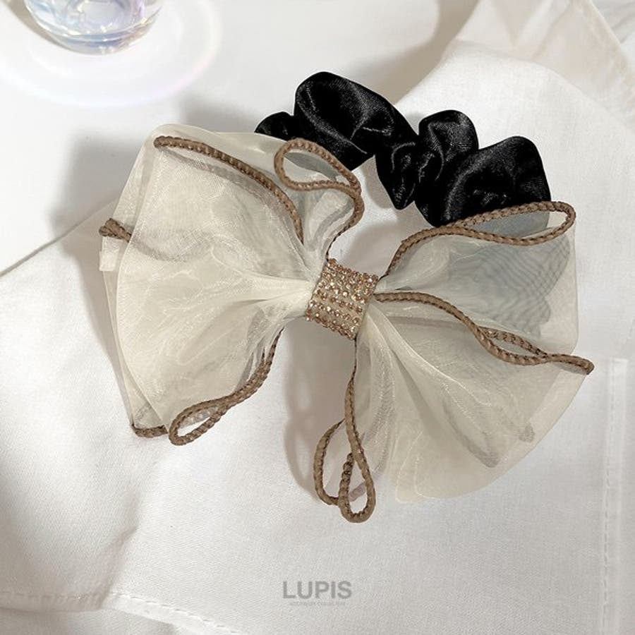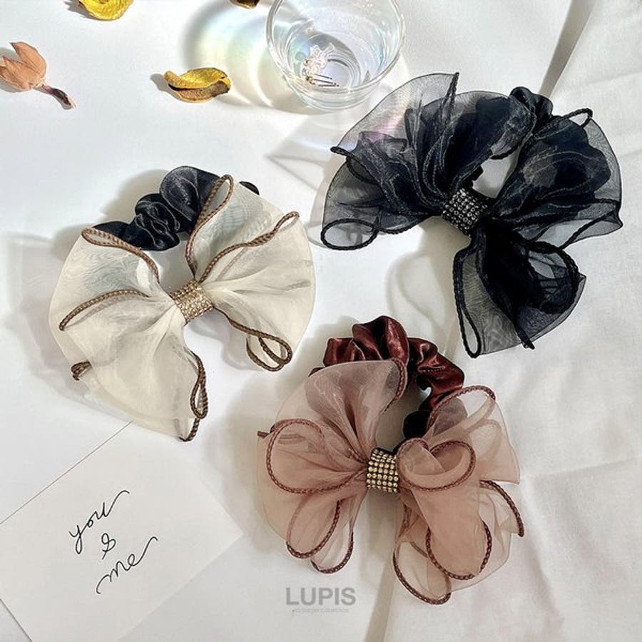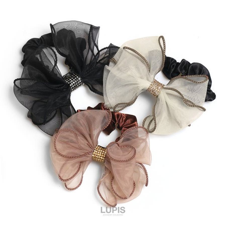 プチプラ ヘアゴム シュシュ リボン 可愛い かわいい 大人 ガーリー フェミニン 上品 大人 おしゃれ きれいめ オーガンジー シアー 透け感 リボン ストーン パヴェ ホワイト ブラック ブラウン 10代 20代 30代 ヘアアクセサリー レディース 女性 アクセサリー アクセ 安い 春 夏 春夏 秋 冬 秋冬 ルピス LUPIS