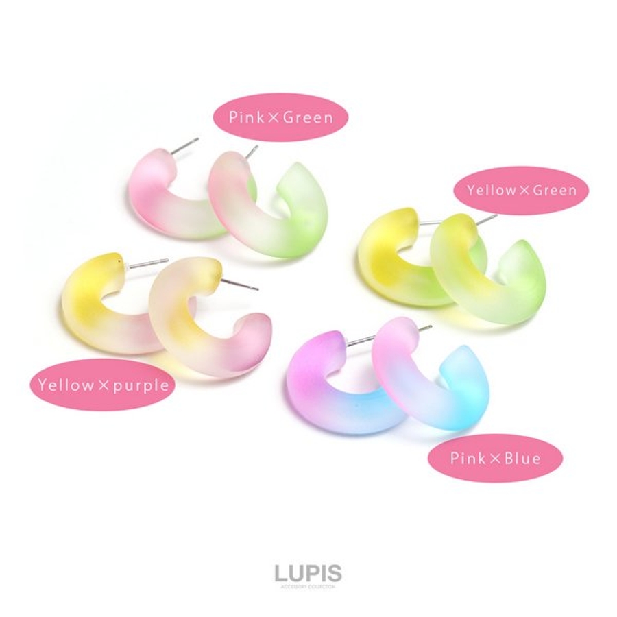 プチプラ ピアス フープピアス アクリル マット かわいい 可愛い おしゃれ オシャレ 爽やか 華やか 映える 差し色 グラデーション バイカラー クリア 半透明 イエロー グリーン パープル ピンク ブルー 10代 20代 30代 レディース 女性 アクセサリー アクセ 安い 春 夏 春夏 秋 冬 秋冬 ルピス LUPIS